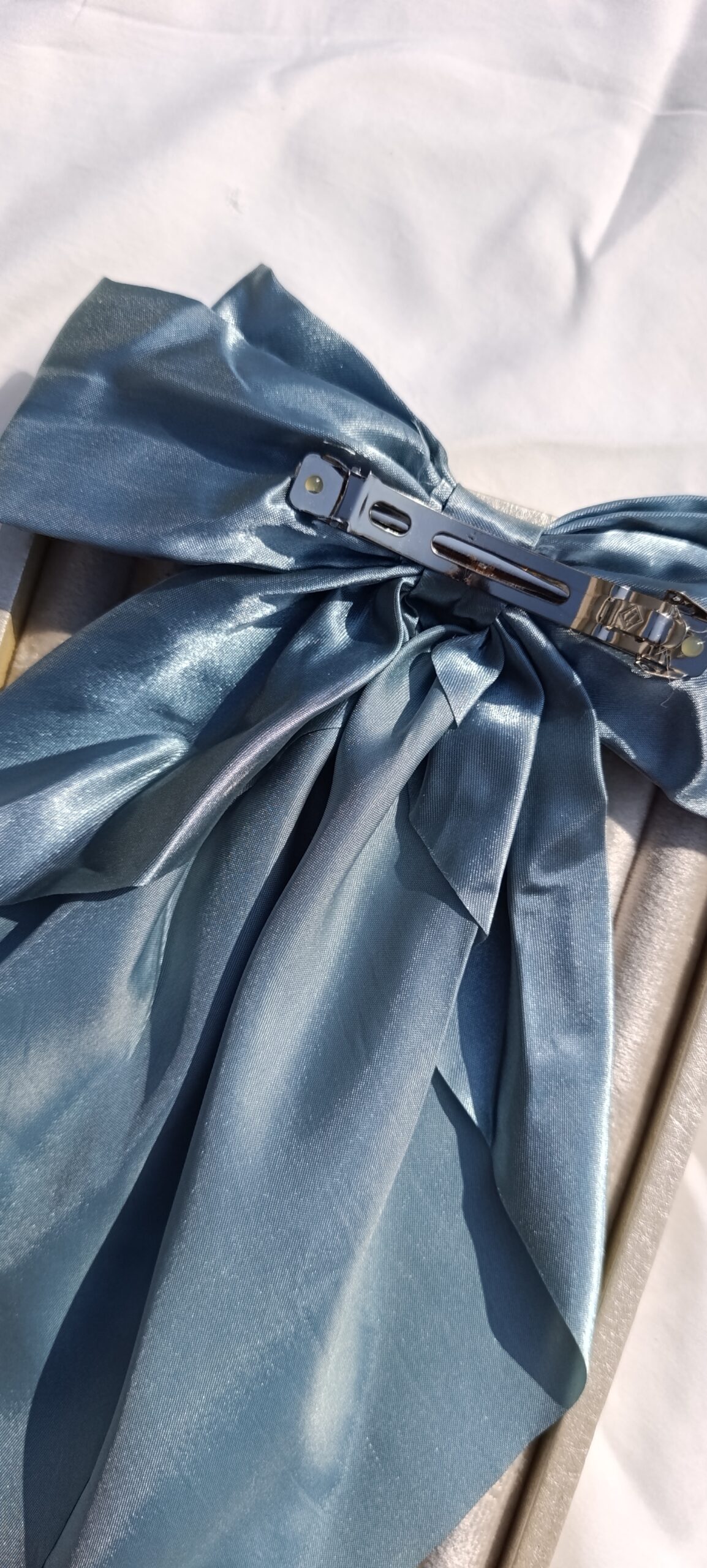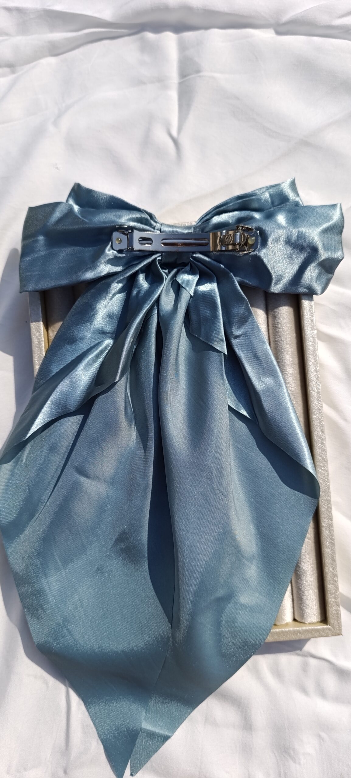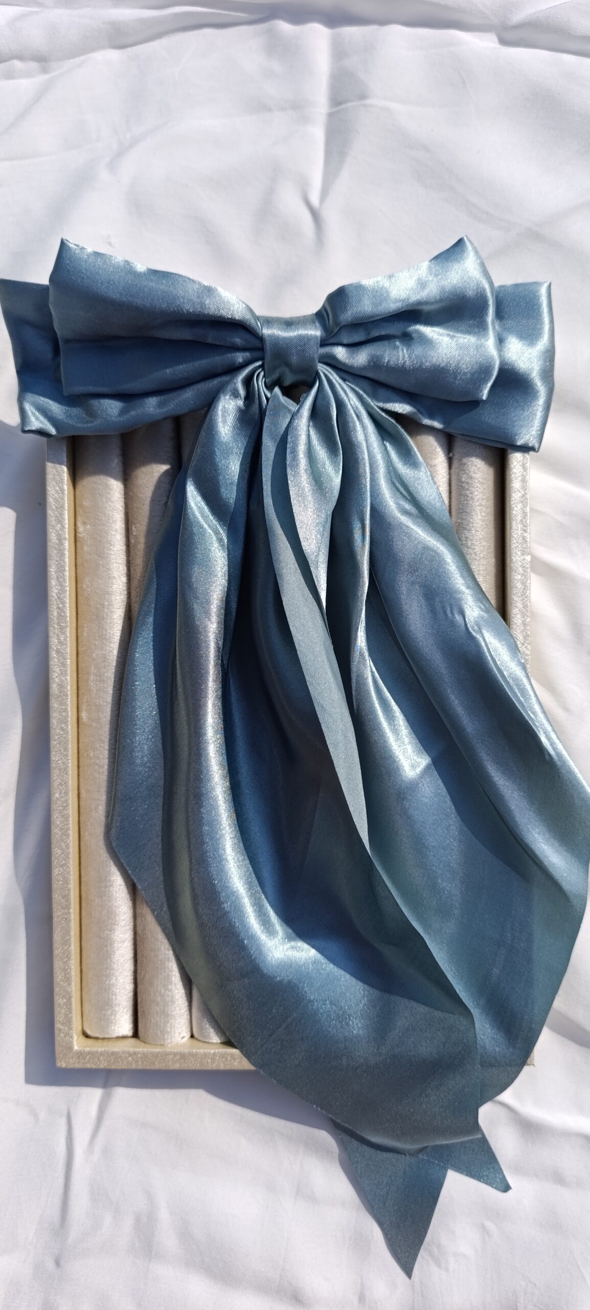 Description: This stunning hair accessory is crafted from premium shimmer-finish satin that catches and reflects light beautifully. The design features a structured multi-layered bow at the top, which transitions into wide, dramatic scarf-like tails that drape gracefully down the hair. It is the perfect statement piece for weddings, formal evenings, or adding a touch of luxury to a half-up hairstyle.