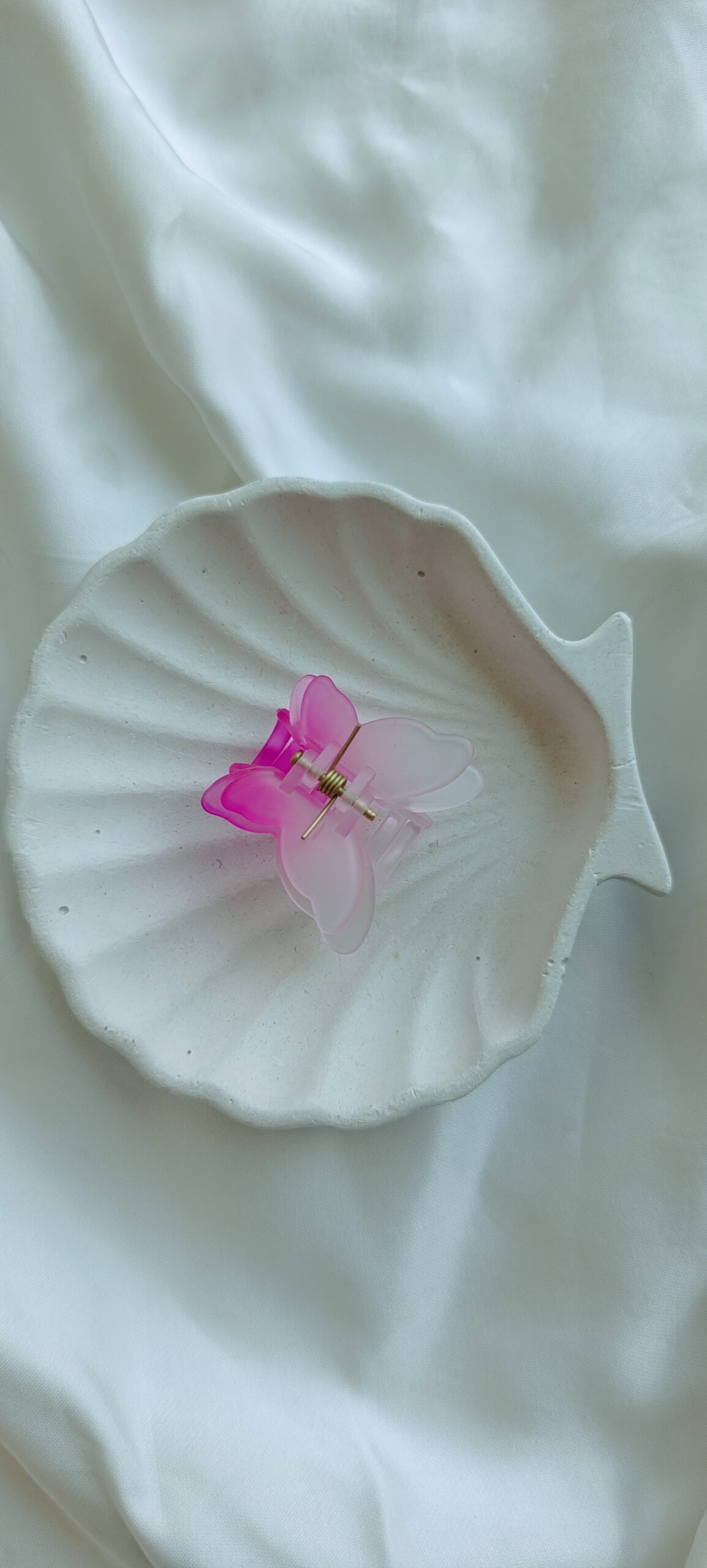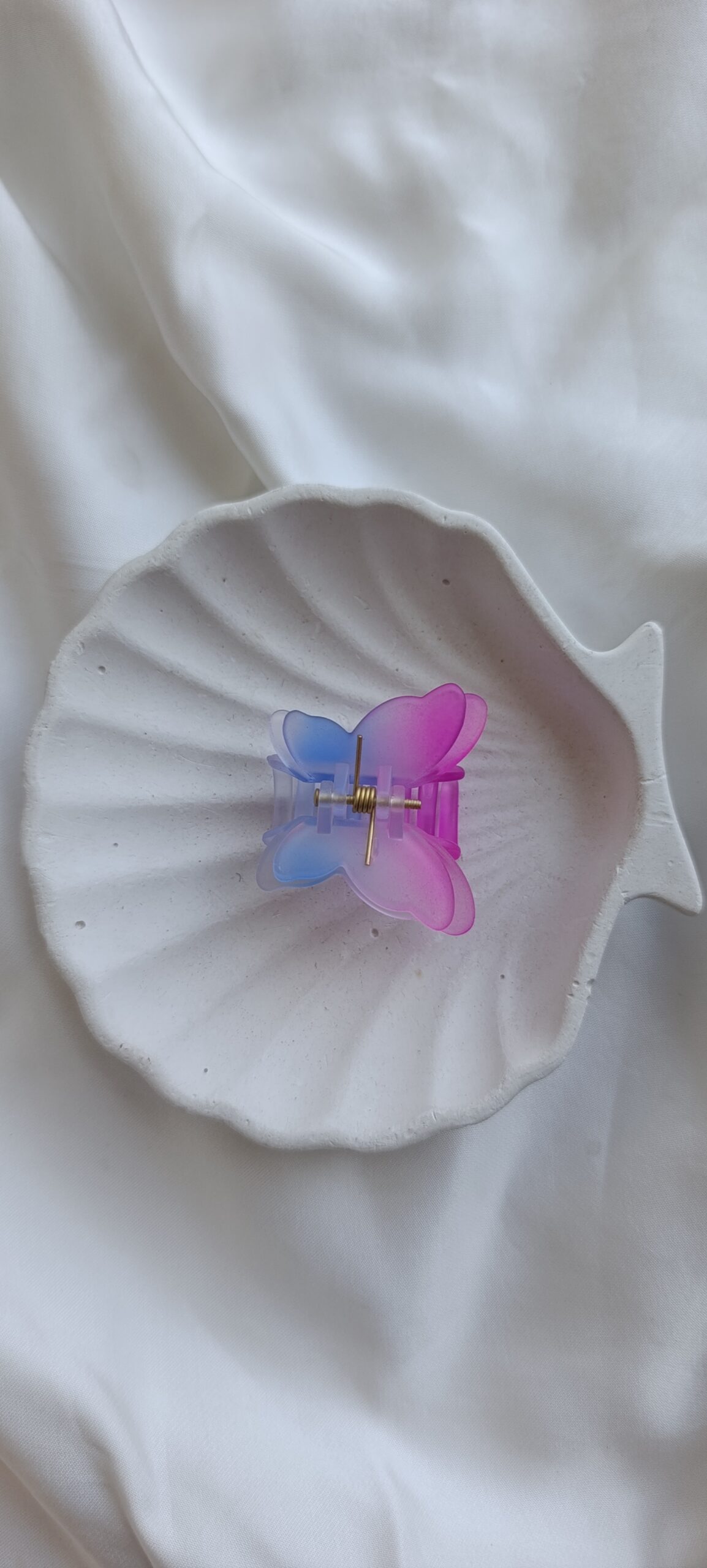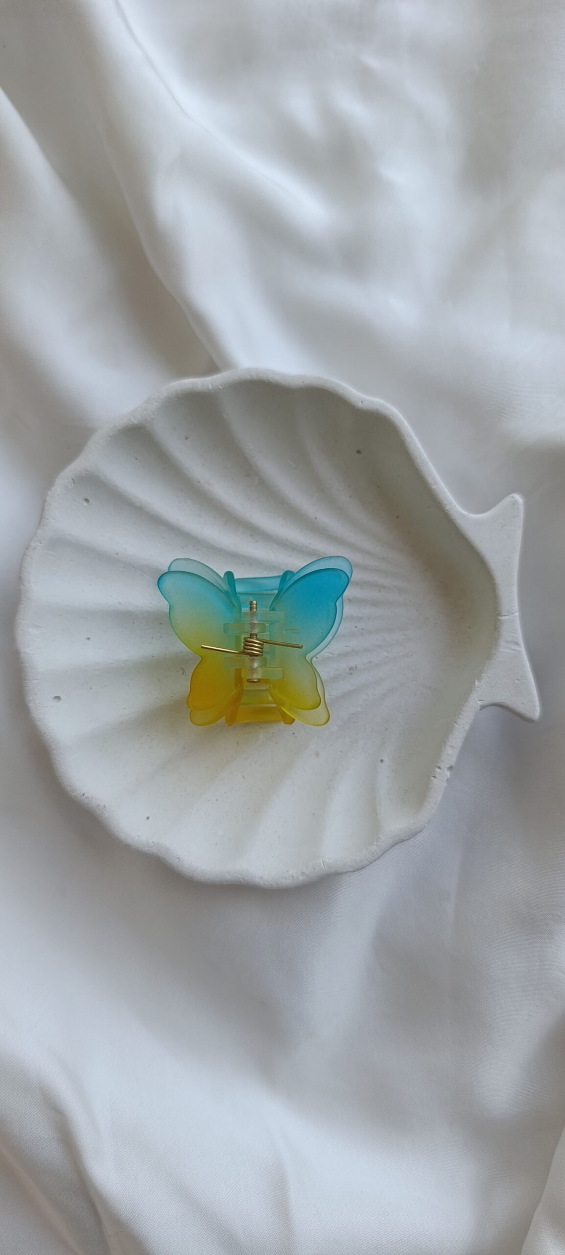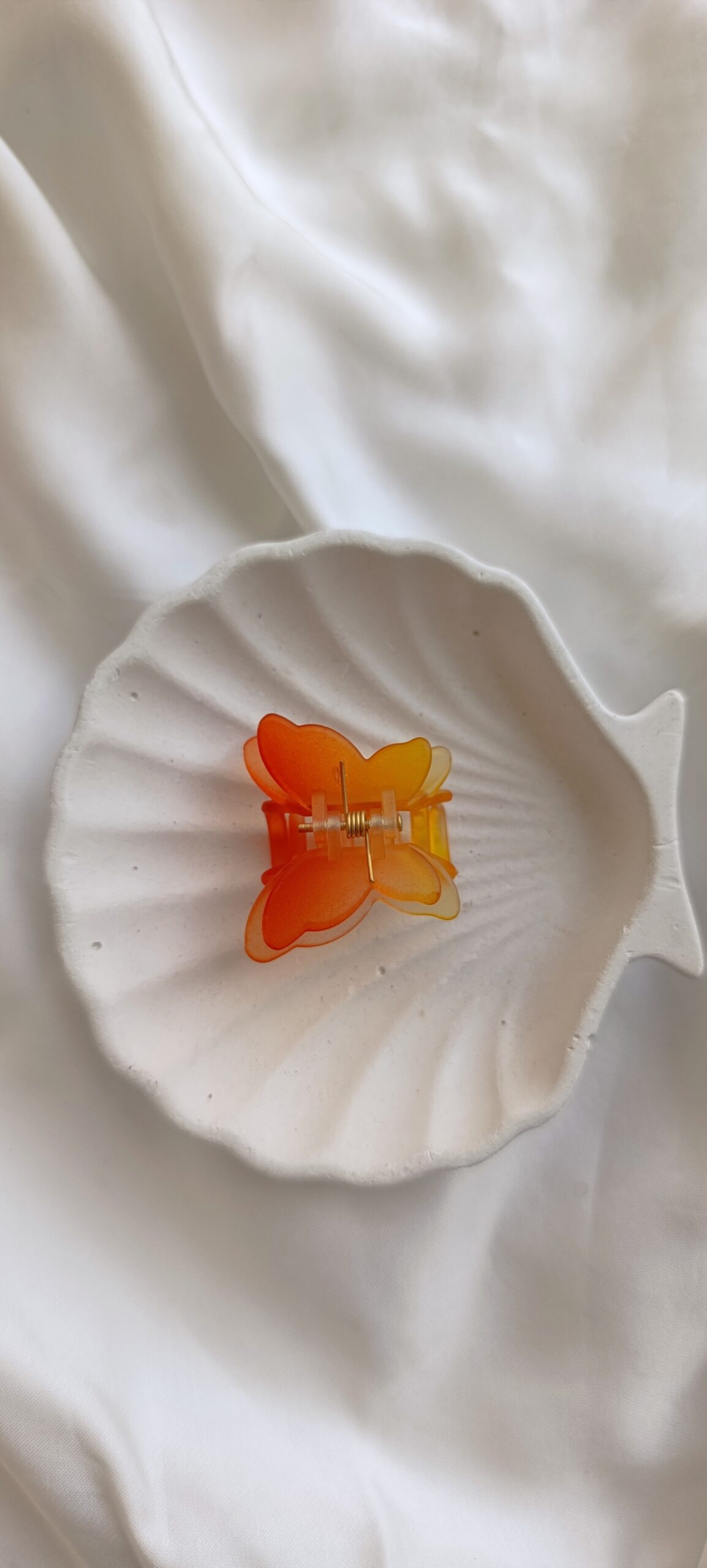 Description: A vibrant, translucent small-clip in the shape of a butterfly. The resin features a stunning horizontal gradient, transitioning from a bright colour to a sunny tropical colour. Its frosted texture gives it a soft, ethereal glow when it catches the light.