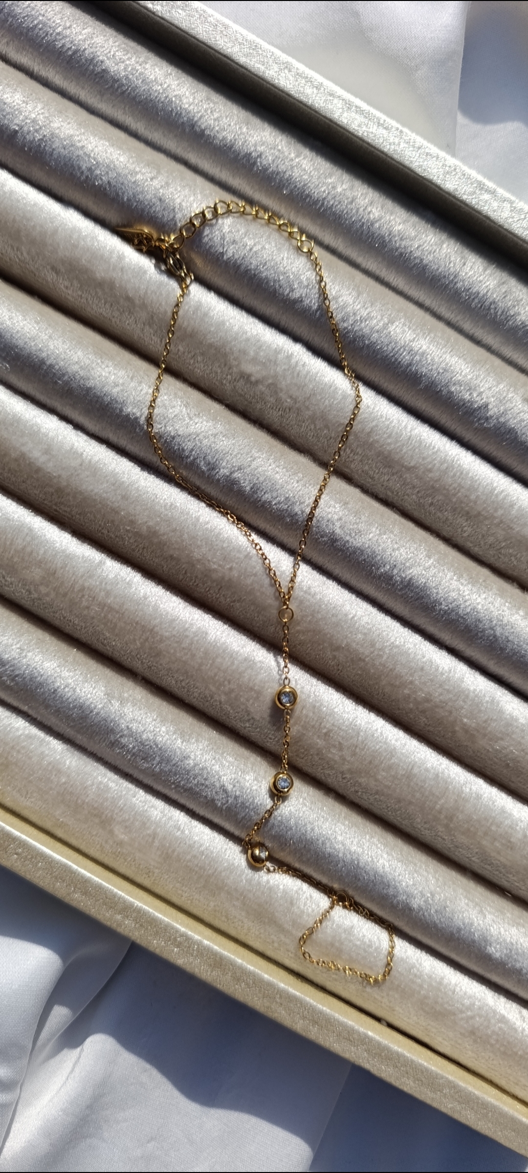 Description: This delicate “hand chain bracelet” connects a dainty wrist chain to a finger loop via a central drop. It features three sparkling, round-cut clear crystals encased in smooth gold bezels, creating a sophisticated bohemian look.