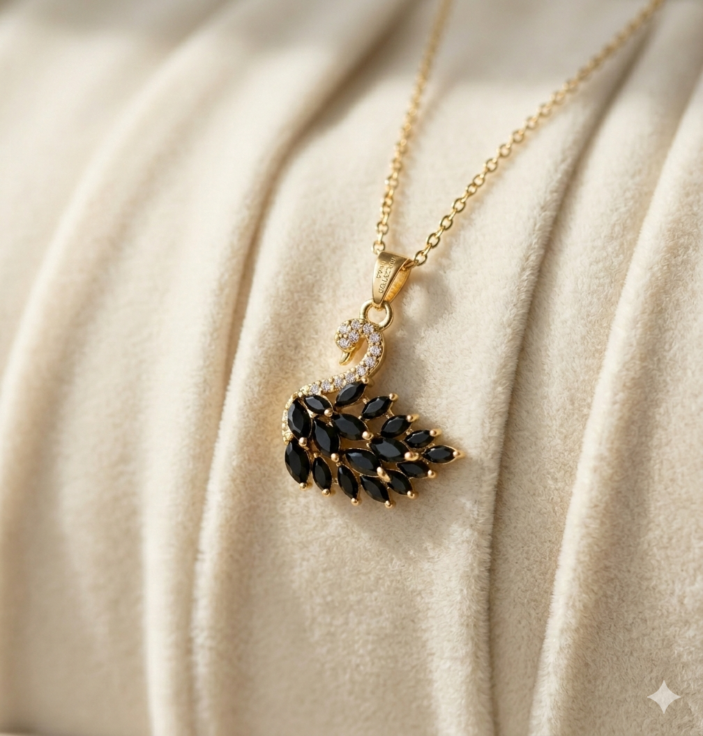 Description: This necklace features a stylized swan pendant. The body is intricately set with black marquise crystals to represent feathers, while the neck is accented with tiny clear pavé stones for a high-contrast, luxurious finish.