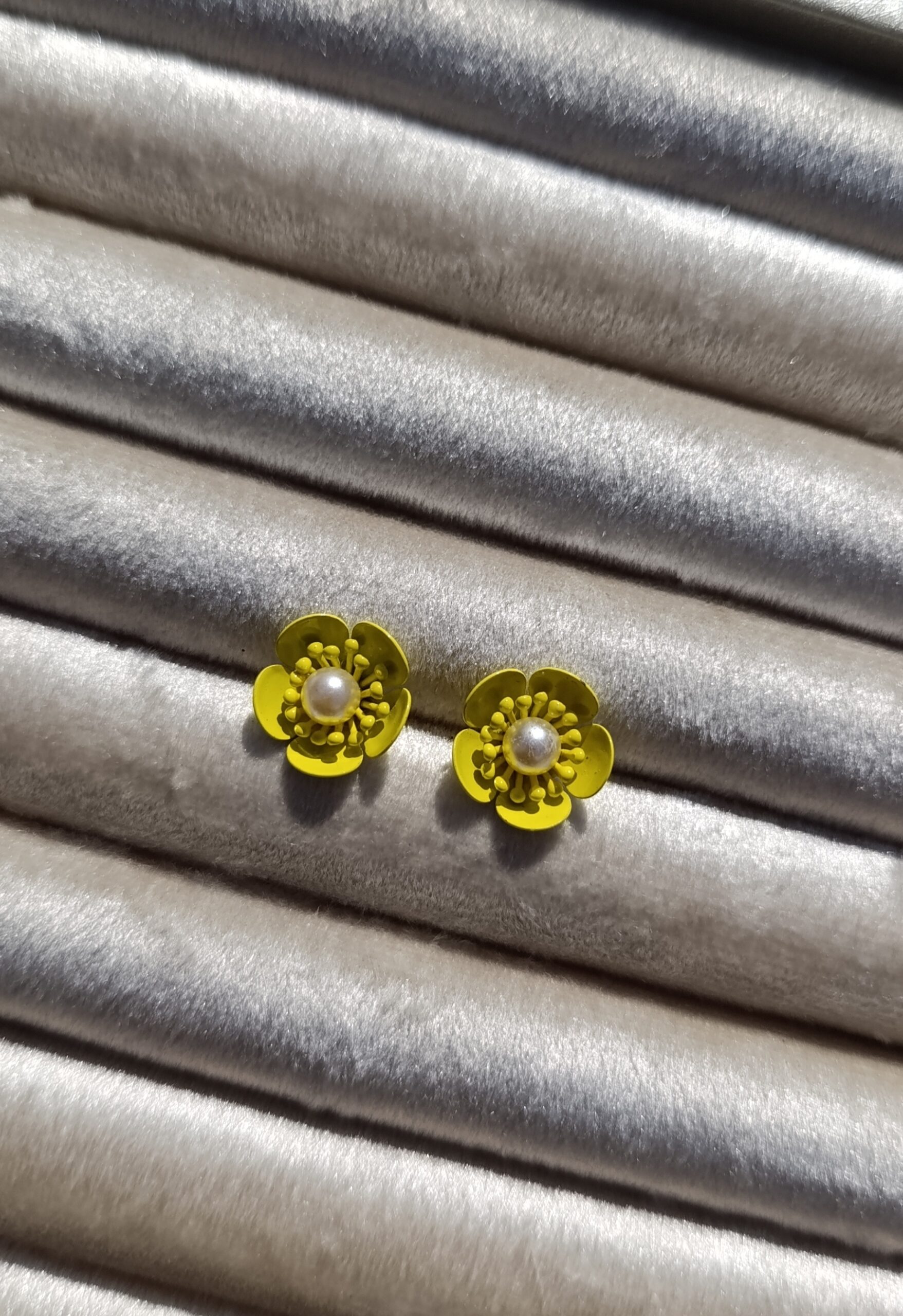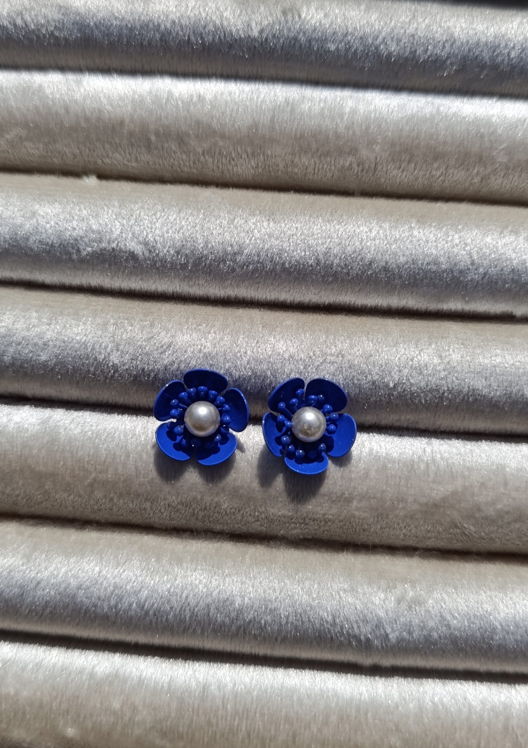 Description: These are multi-layered flower studs. The design features a cluster of “stamens” in the center surrounding a single, creamy faux-pearl.
