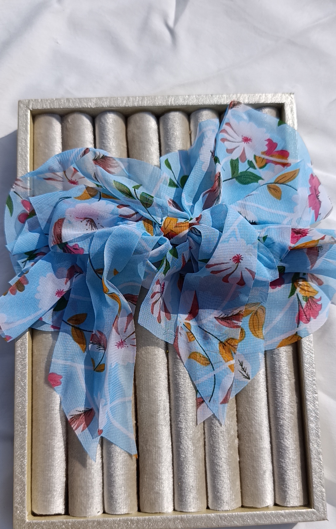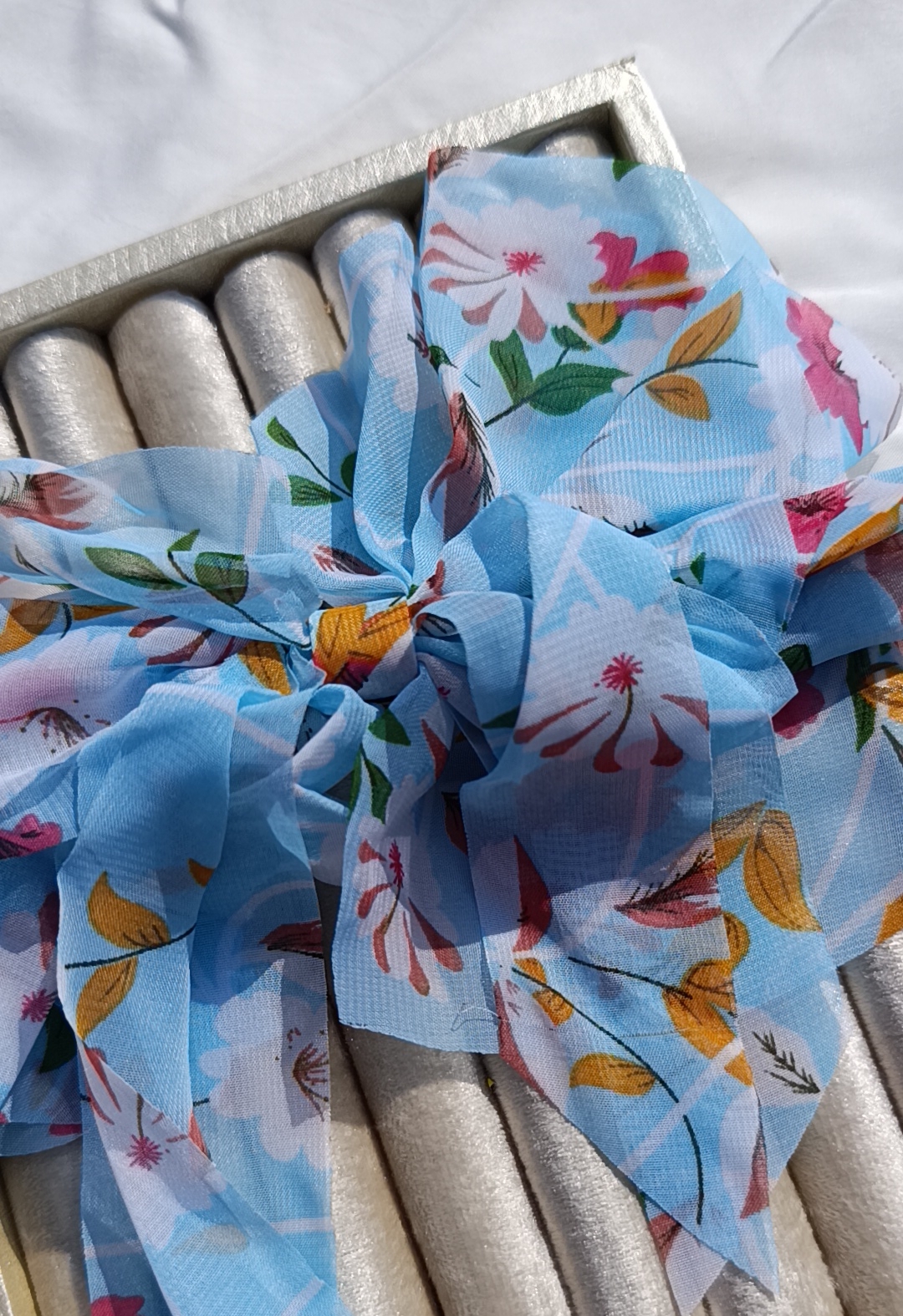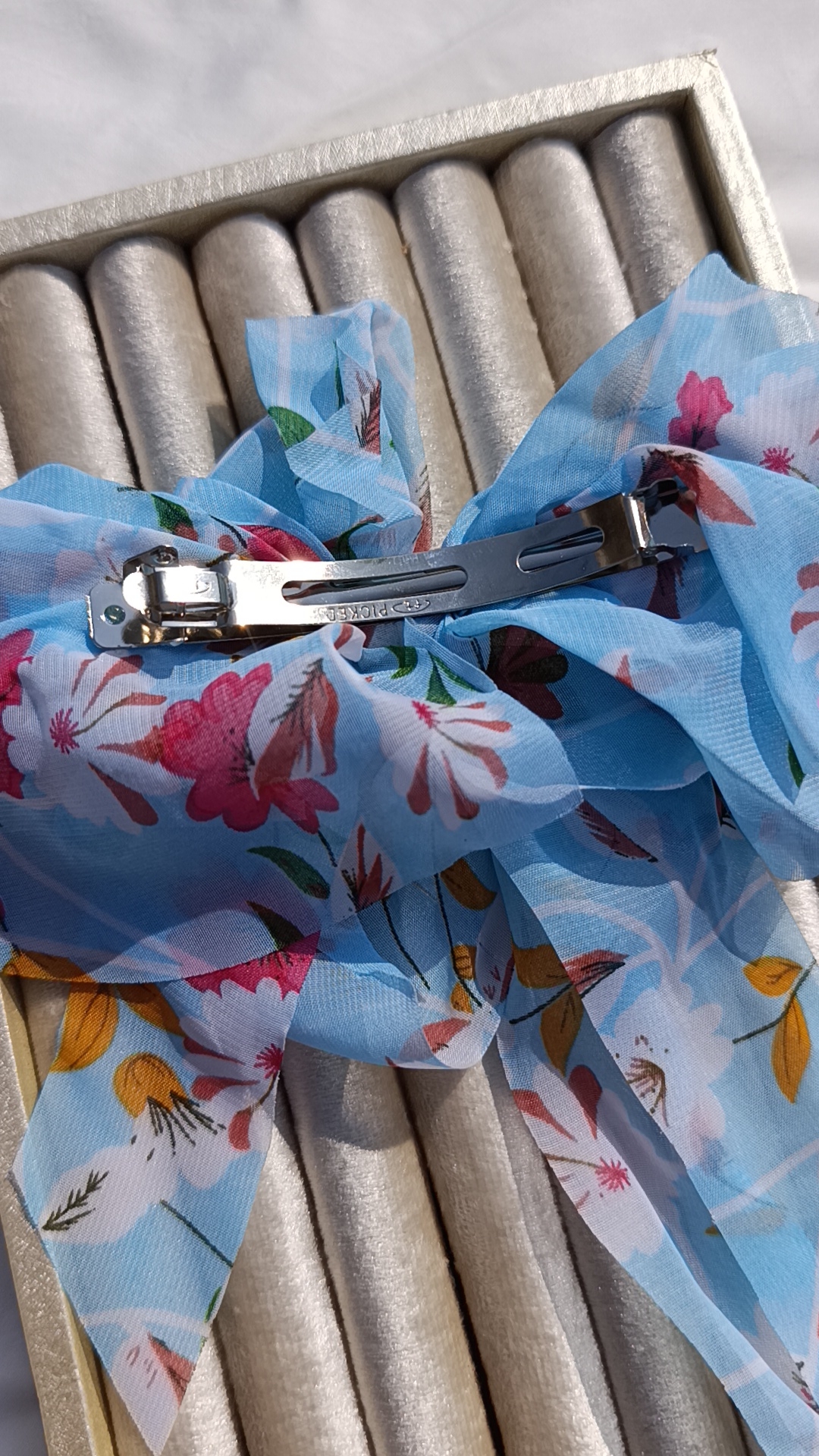 Description: This airy, ethereal hair clip is perfect for spring and summer. Made from lightweight blue chiffon with a vibrant pink and white wildflower print, it is attached to a sturdy metal French barrette. The “messy bow” construction provides a soft, effortless look to any hairstyle.
