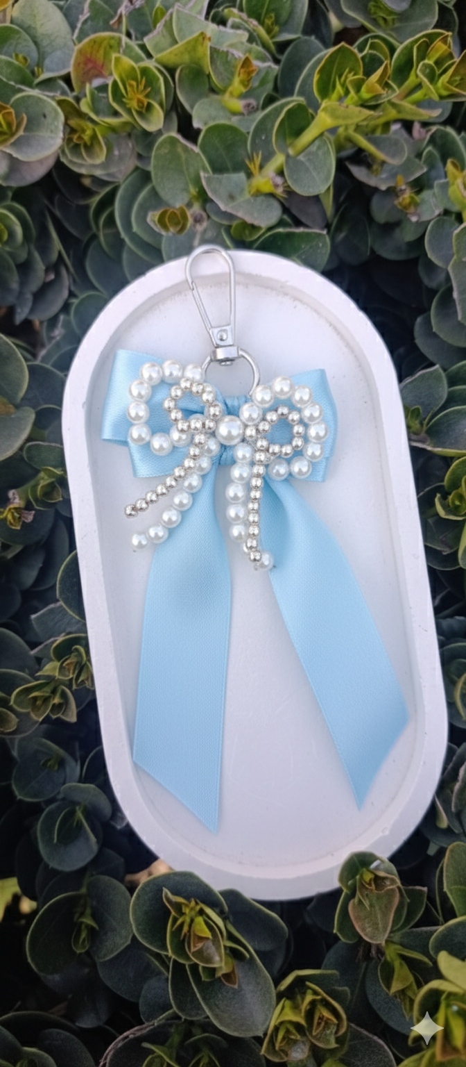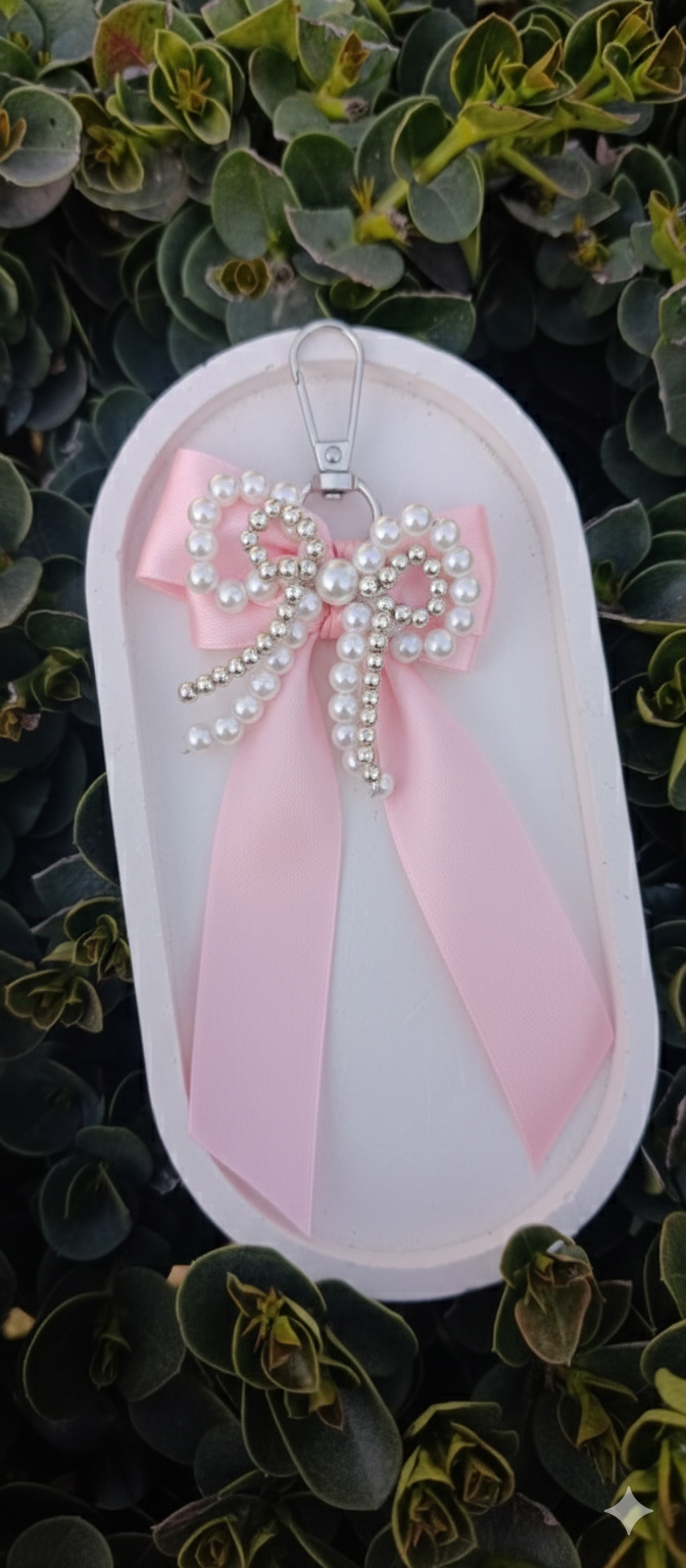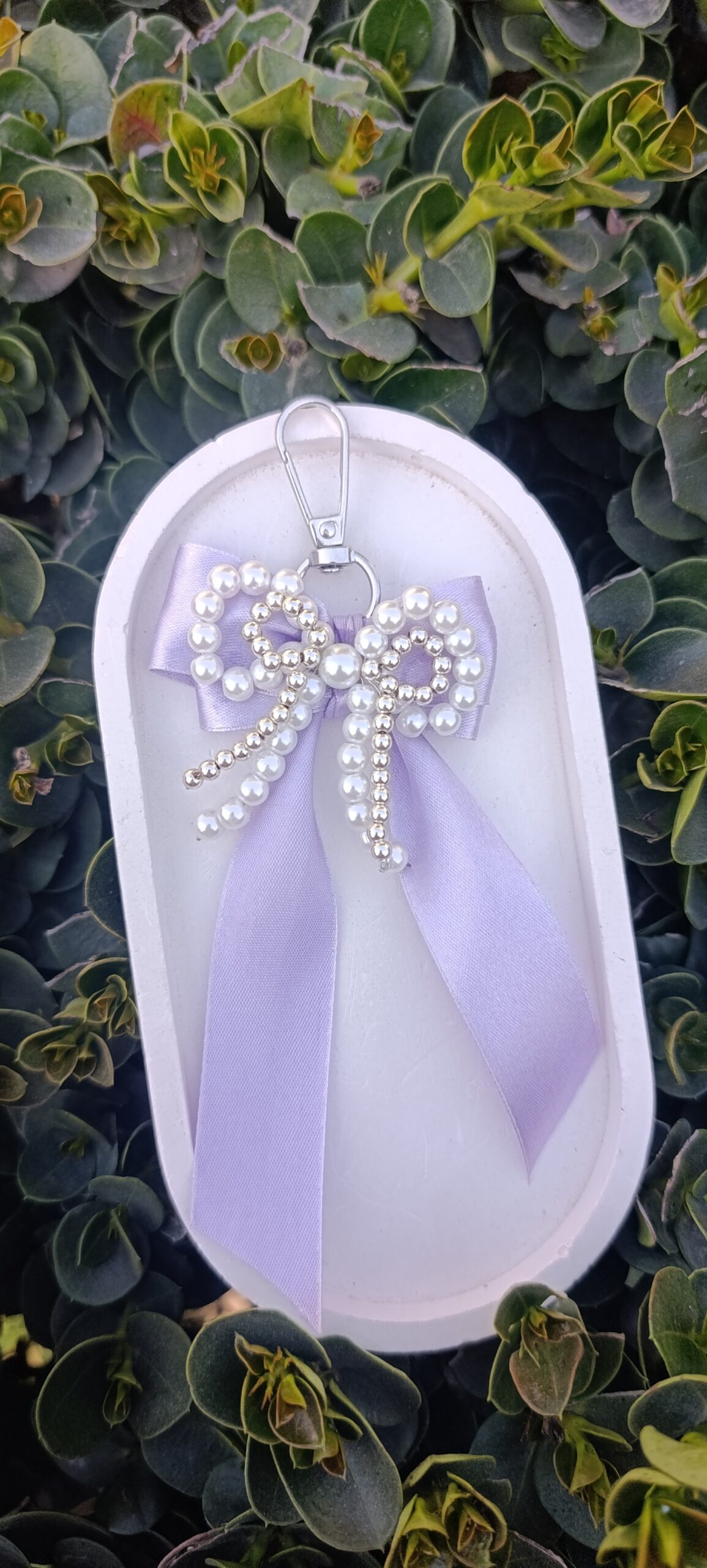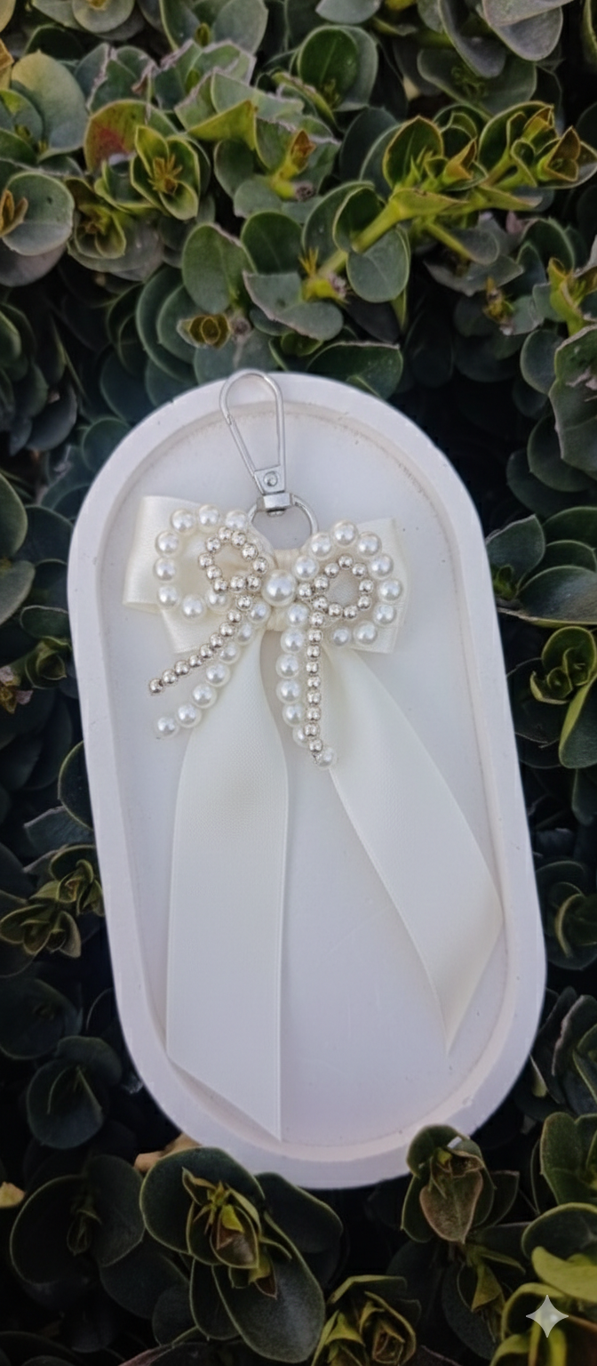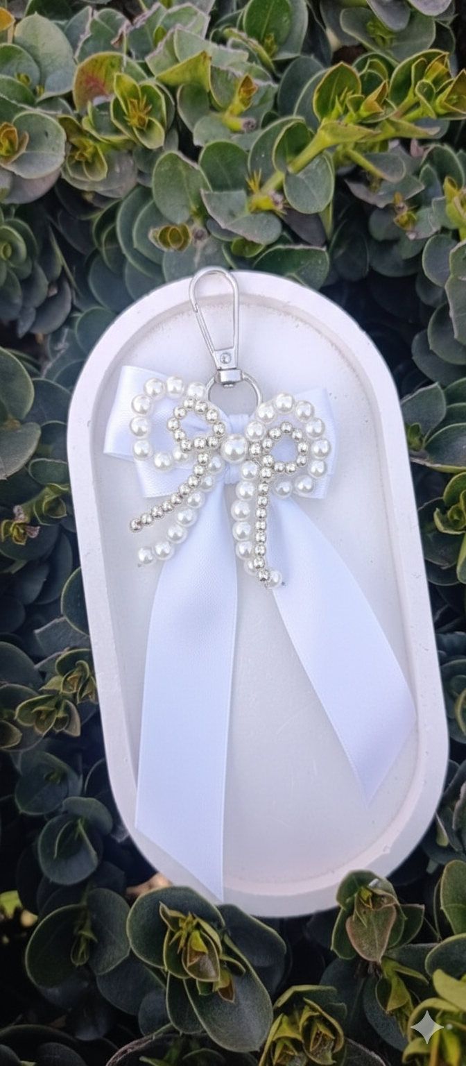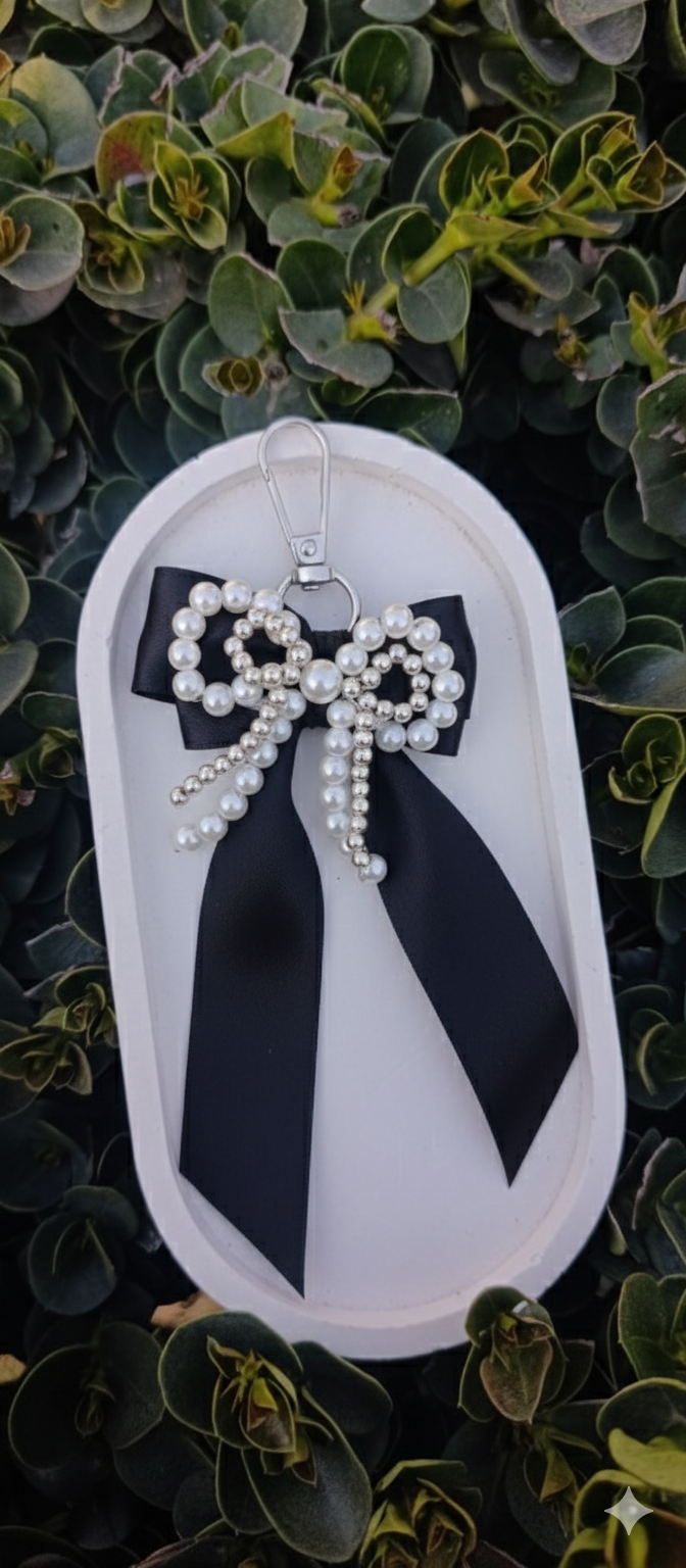 Description: A multi-layered accessory featuring a silky satin ribbon bow topped with an intricate “double loop” of white and silver pearls. This charm is attached to a sturdy silver-toned lobster clasp, making it a perfect decorative piece for handbags, keys, or journals.