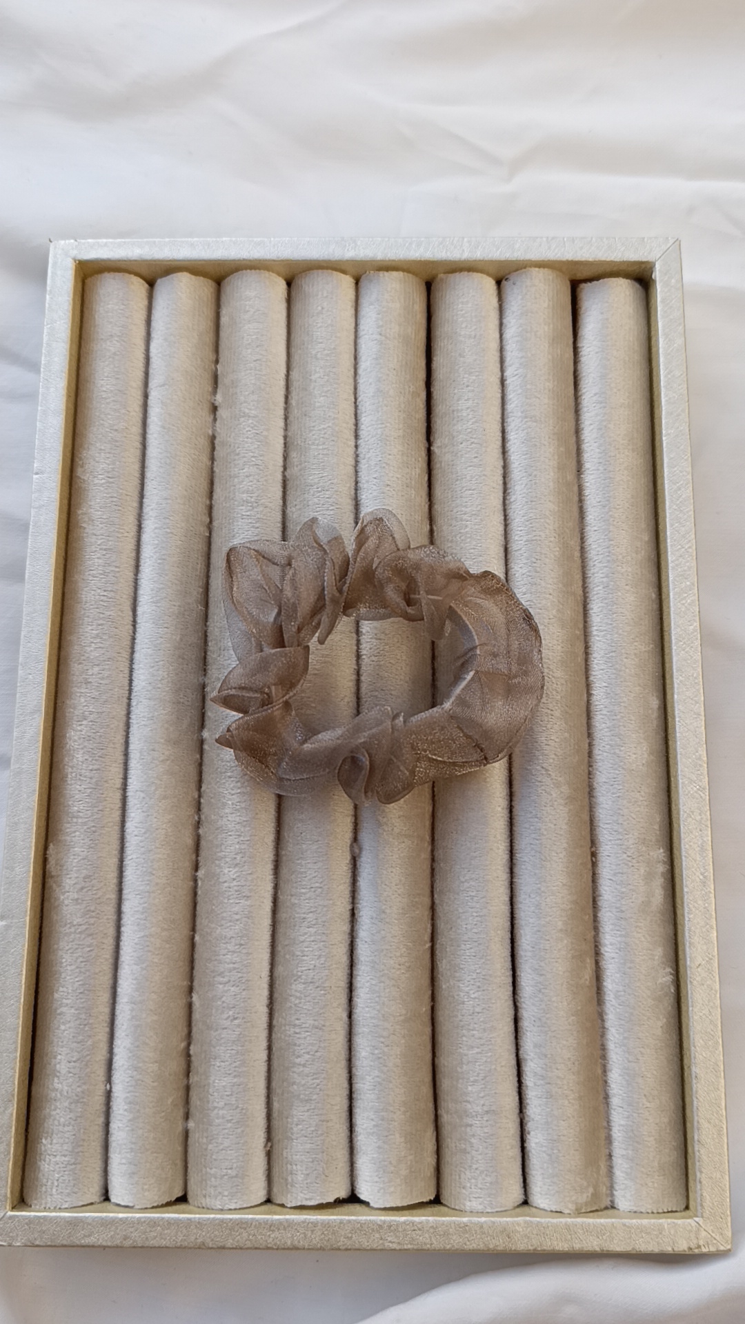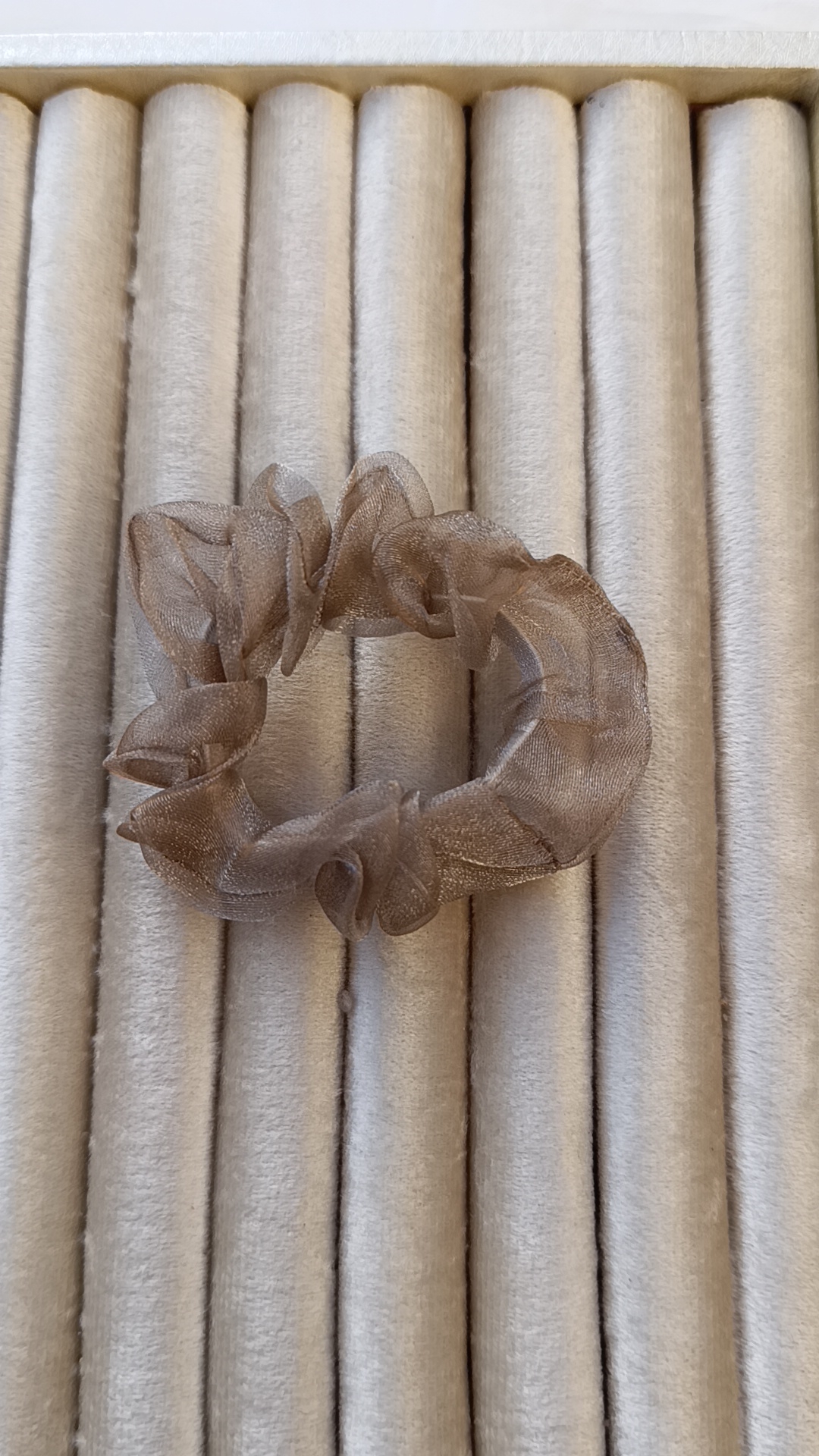 Description: This ethereal accessory is crafted from high-quality organza that catches the light with a metallic bronze sheen. The fabric is naturally stiff yet lightweight, allowing the scrunchie to hold a voluminous, “cloud-like” shape that doesn’t fall flat. It’s perfect for adding a sophisticated, airy finish to a sleek high bun.