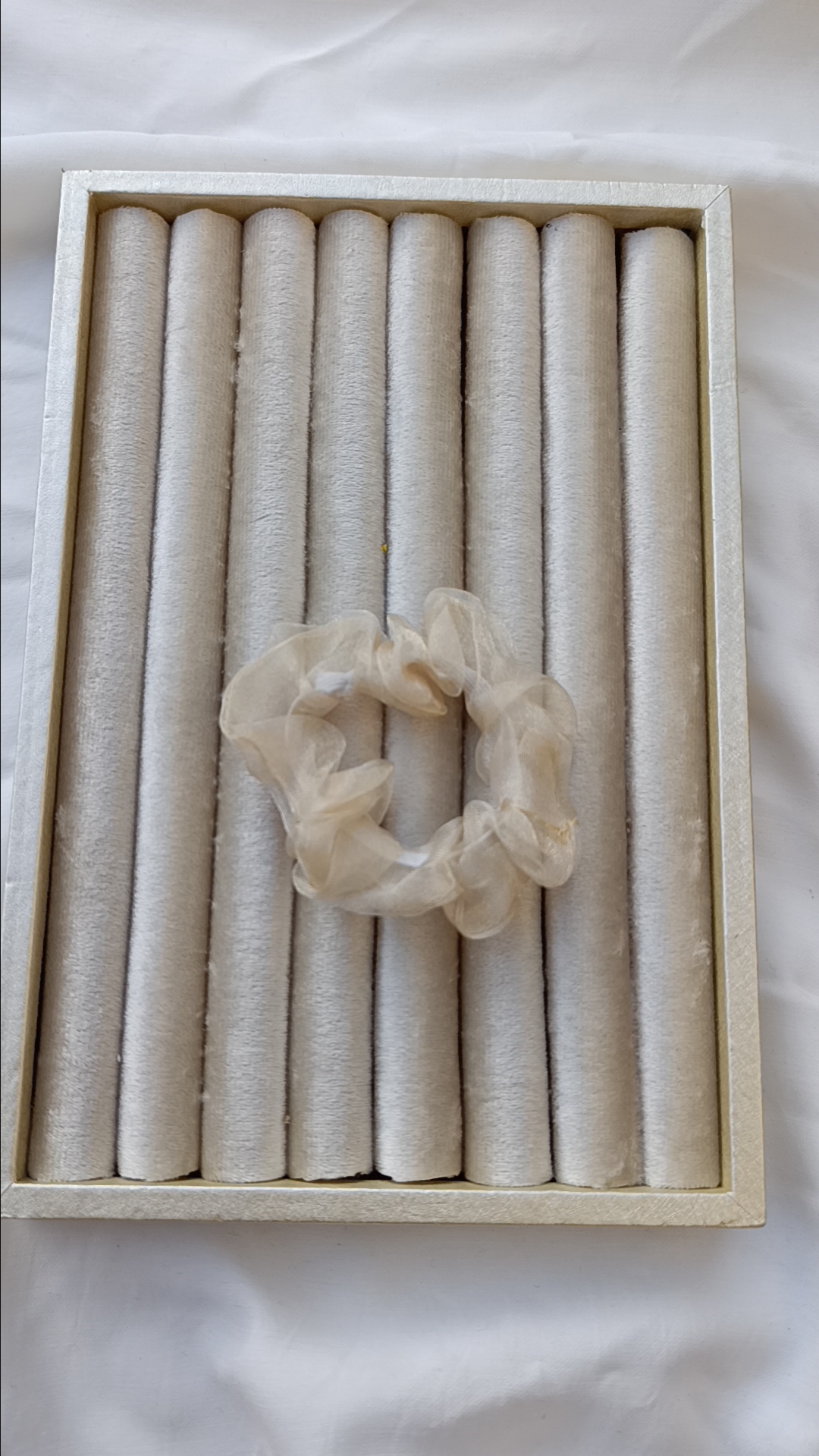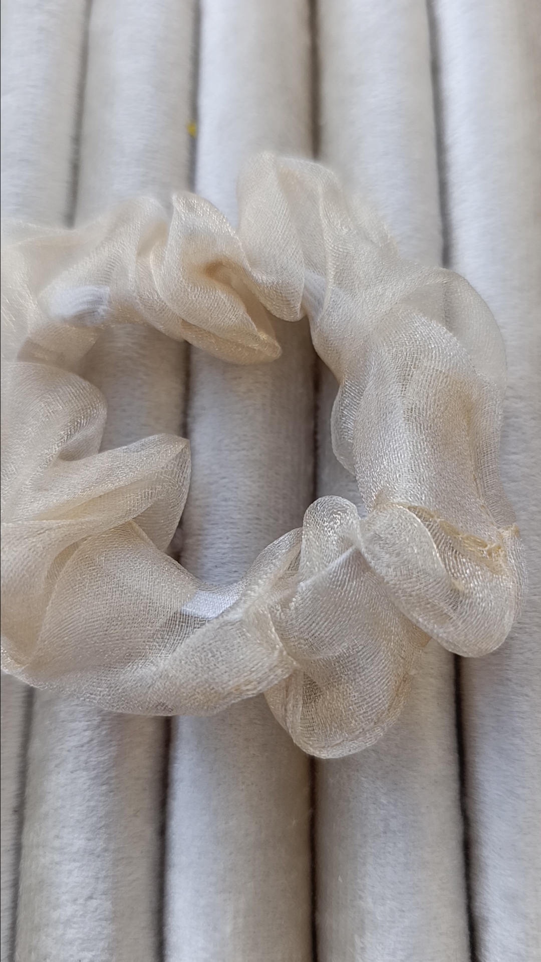 Description: This piece is all about the “clean girl” aesthetic. The champagne organza is so fine it’s almost transparent, creating a soft, halo-like effect around your hair.