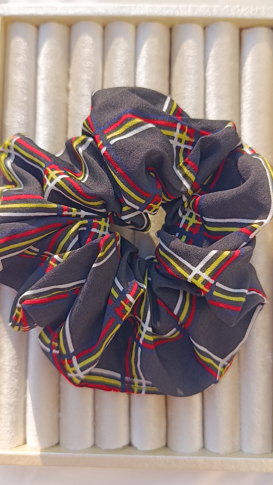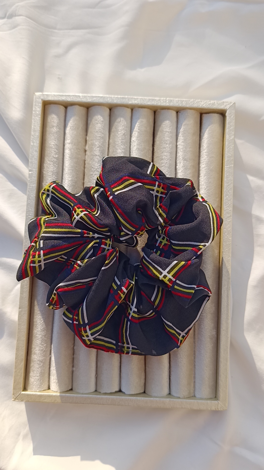 Description: A cozy, academic-inspired accessory. This oversized scrunchie features a dark navy or black base with a vibrant red, yellow, and white plaid (tartan) pattern. The heavy-duty fabric holds its shape well, providing a bold “pop” of pattern to dark hair.