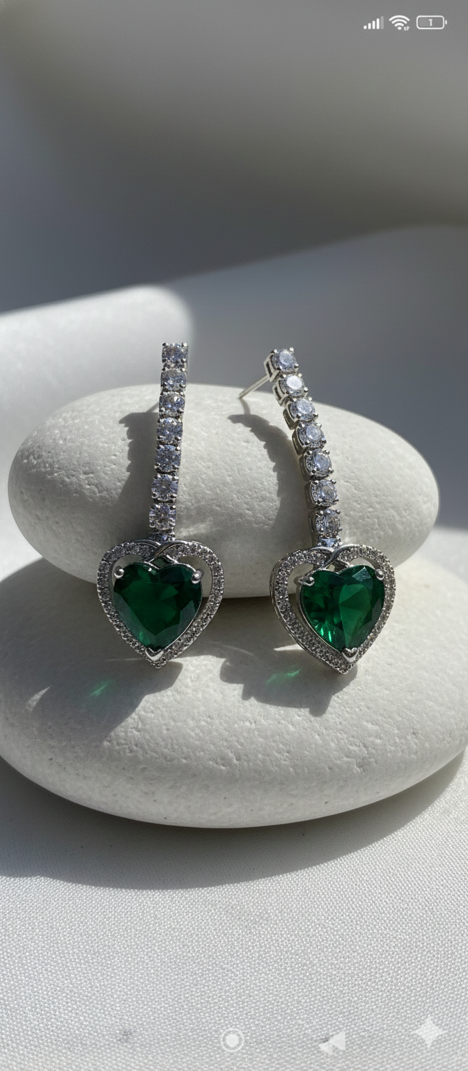 Description: These exquisite earrings feature a vibrant, heart-cut emerald-toned gemstone nestled within a shimmering halo of cubic zirconia. The heart hangs elegantly from a sophisticated vertical bar encrusted with round-cut brilliant stones, creating a perfect balance of romance and luxury.