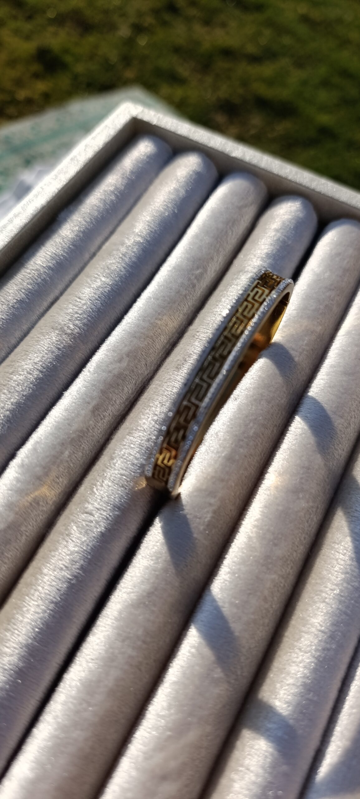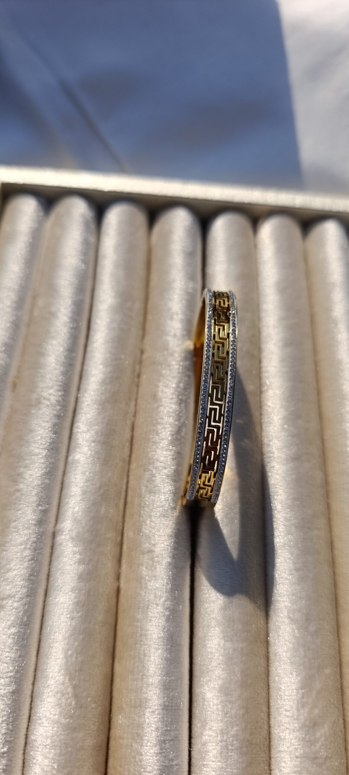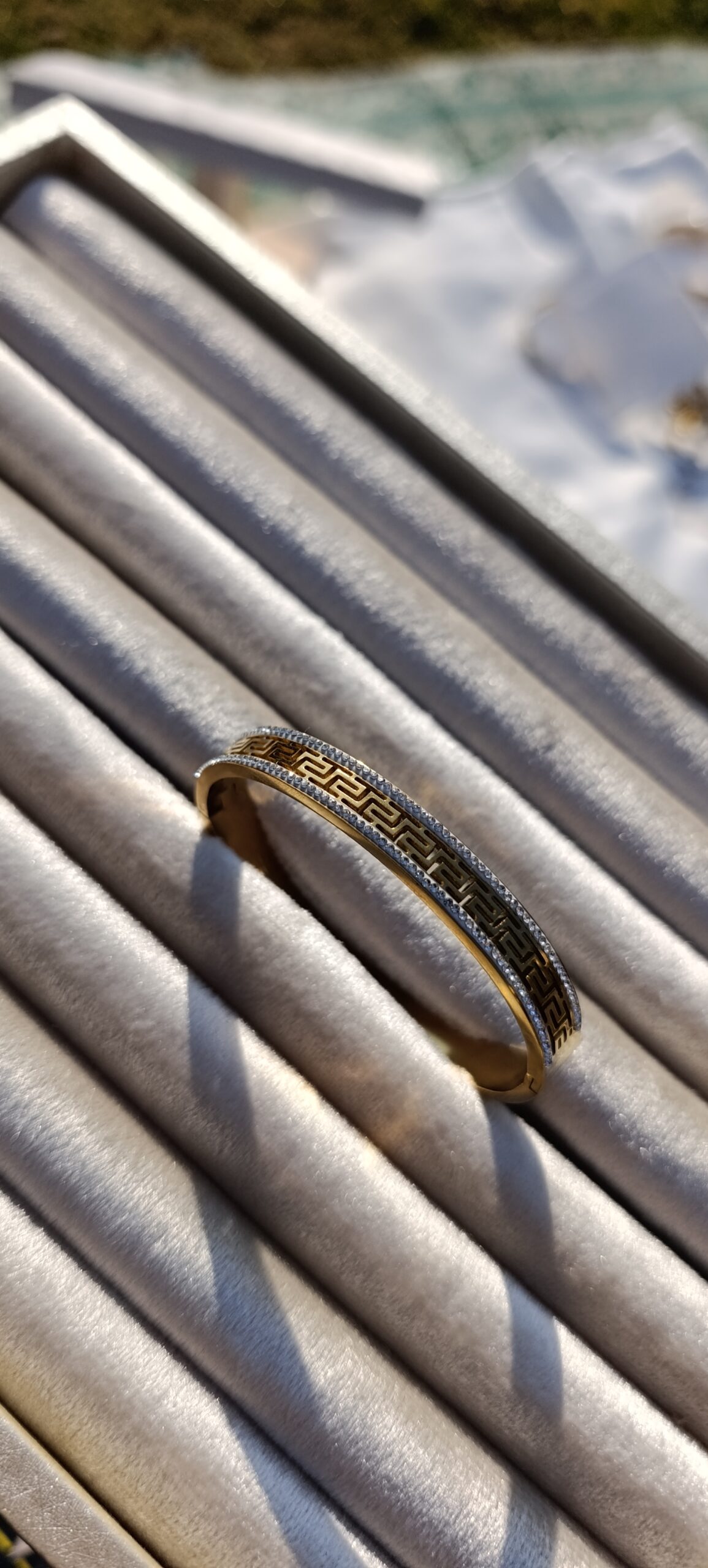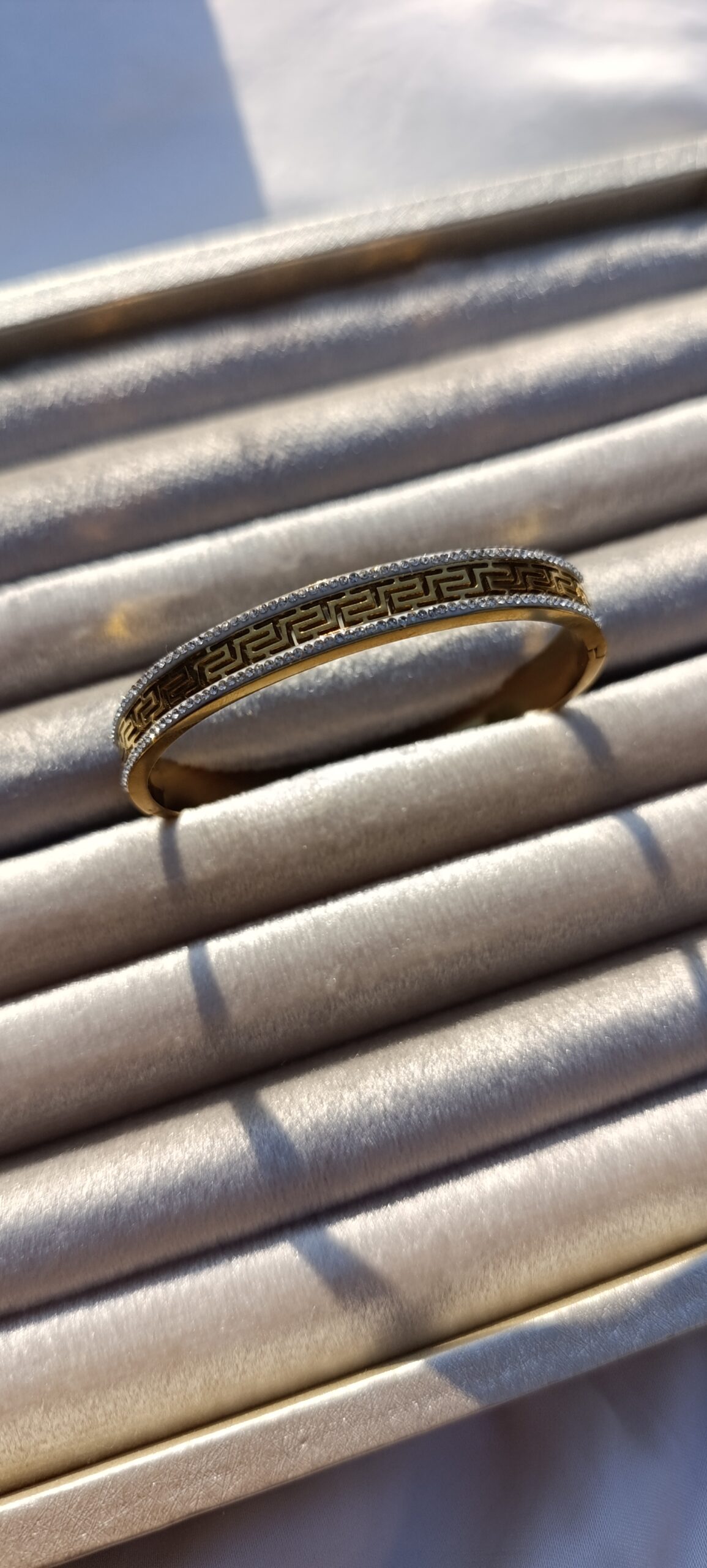 Description: This bangle pays homage to classic architecture with an engraved “Meander” or Greek Key pattern. The central gold motif is elegantly framed by two rows of shimmering crystals, creating a luxurious, vintage-inspired look.