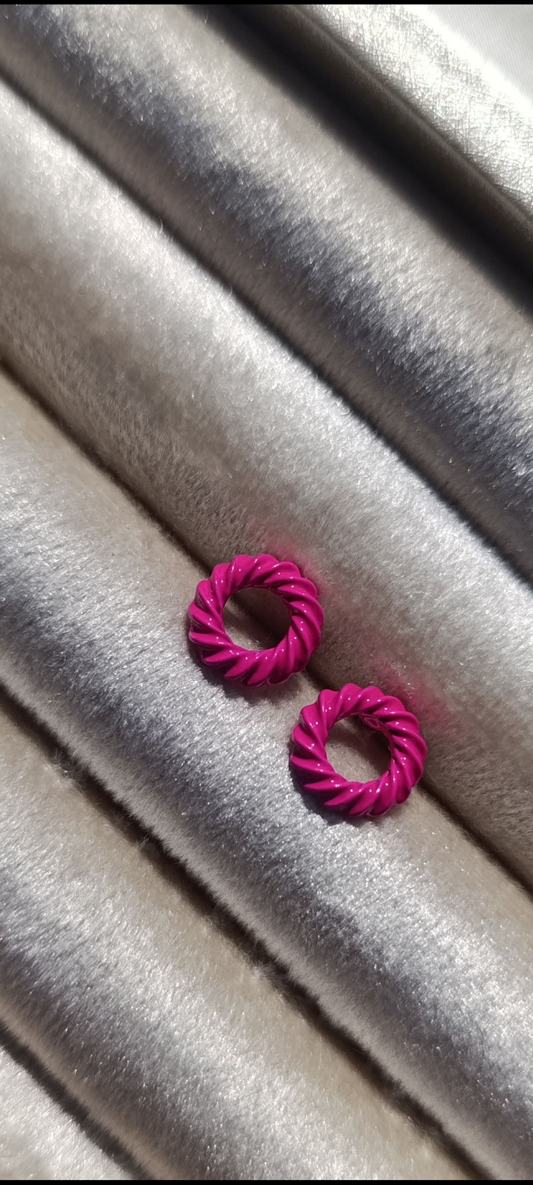 Description: These are small, circular stud earrings with a textured, “twisted rope” or “croissant” style design. They are coated in a vibrant, glossy paint.