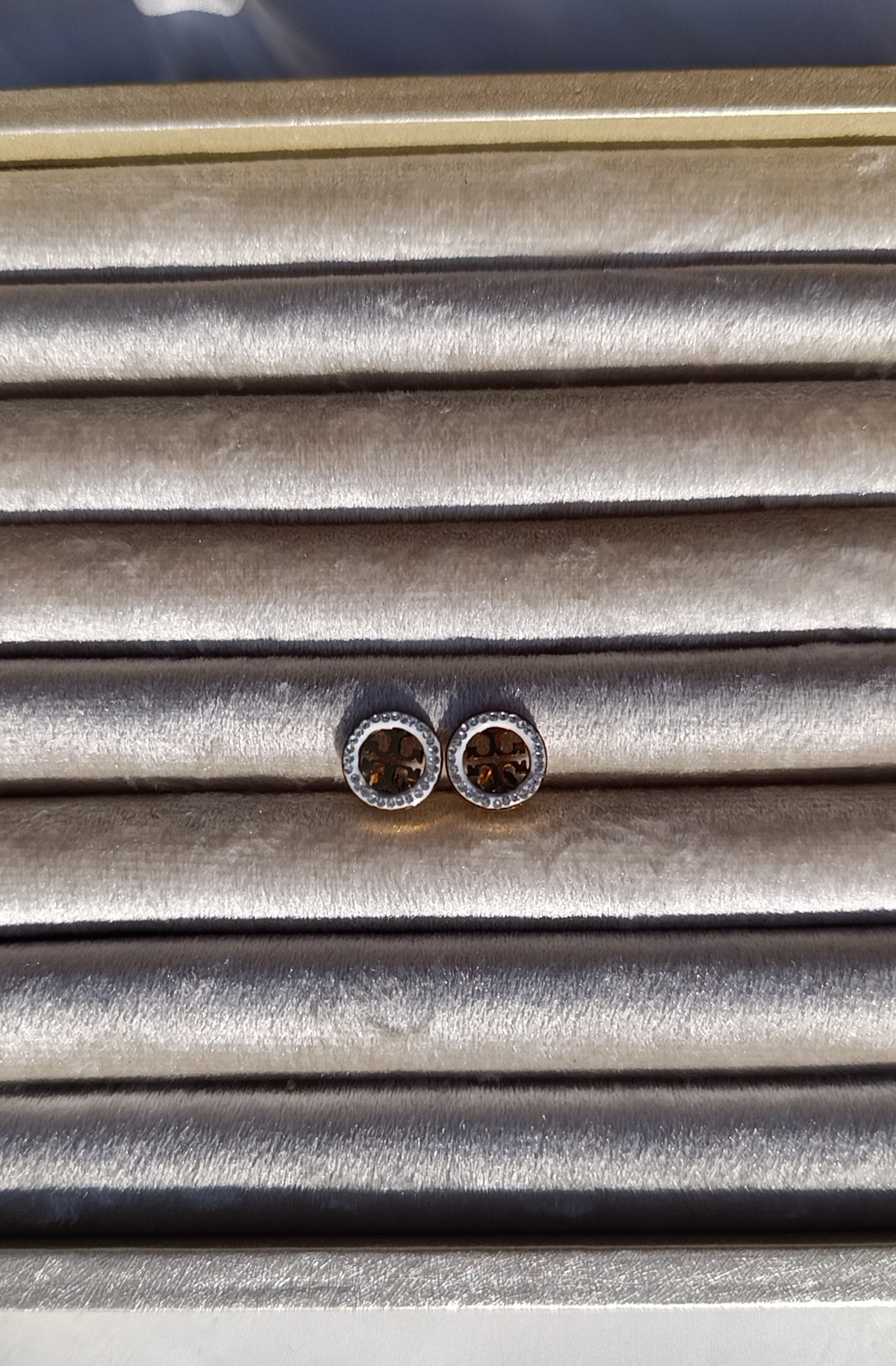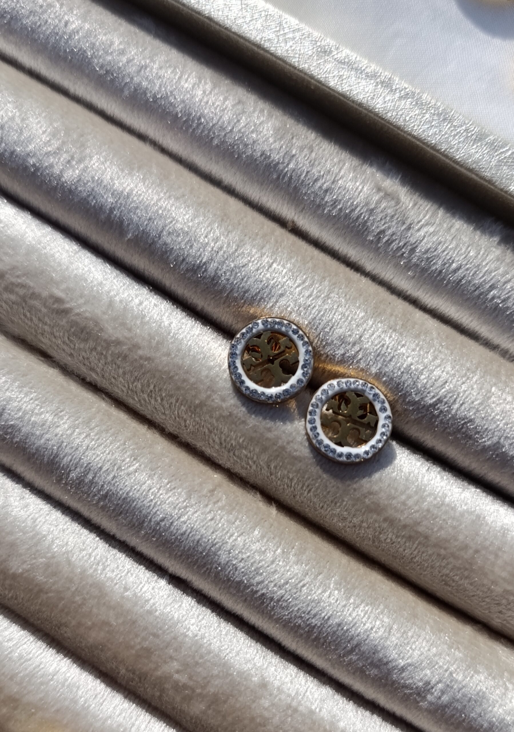 Description: Elegant circular stud earrings featuring a designer-inspired cutout logo and halo crystals.