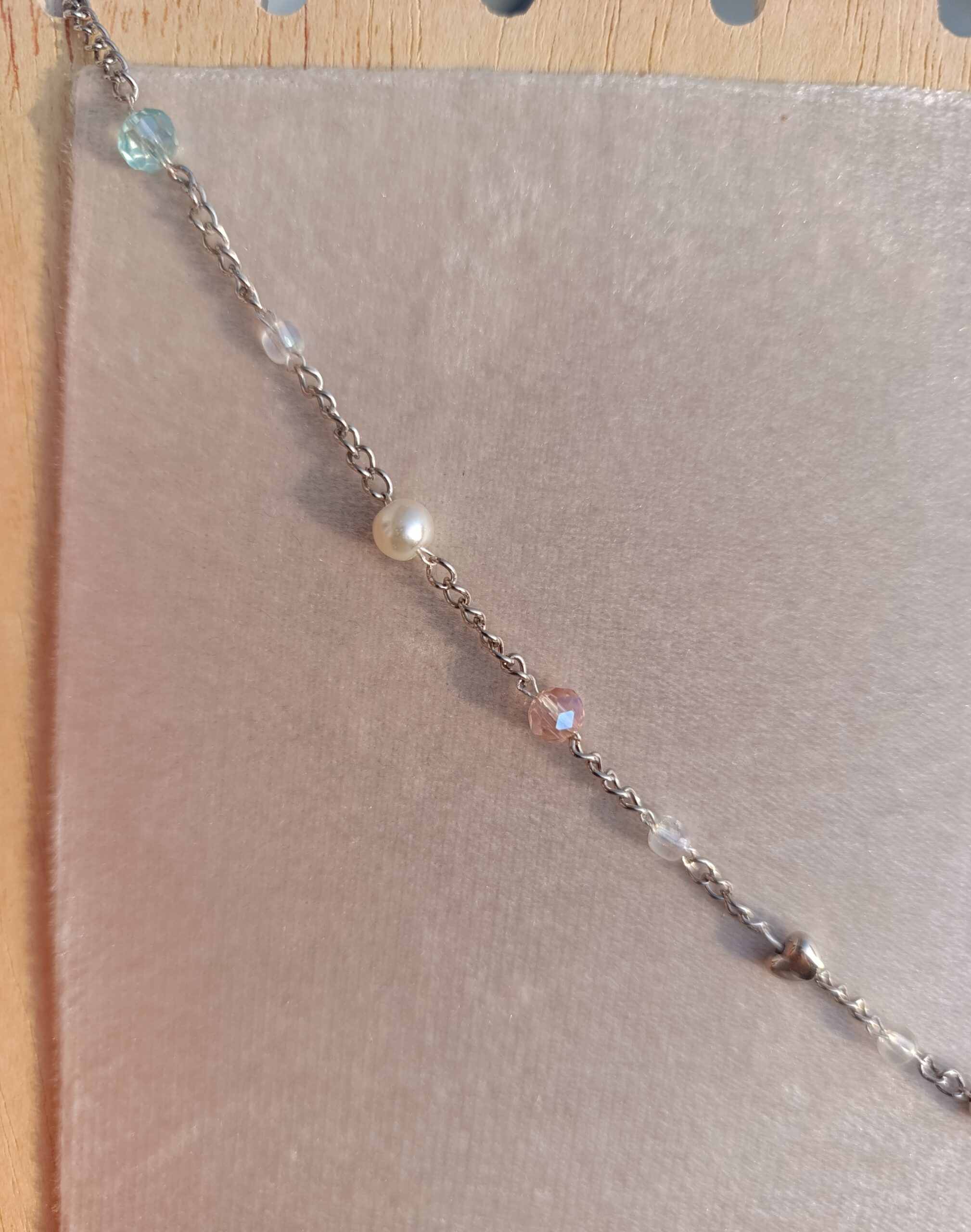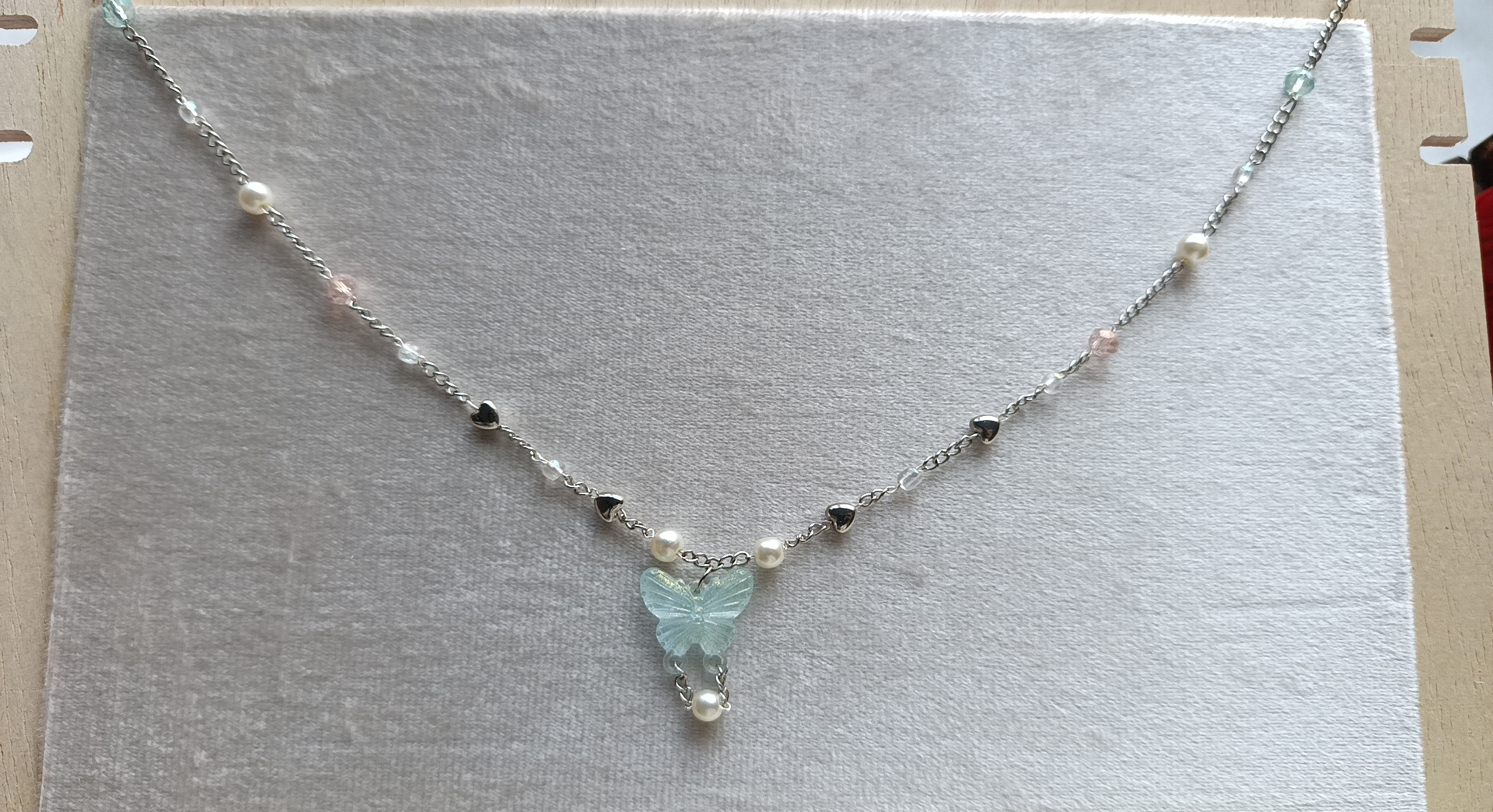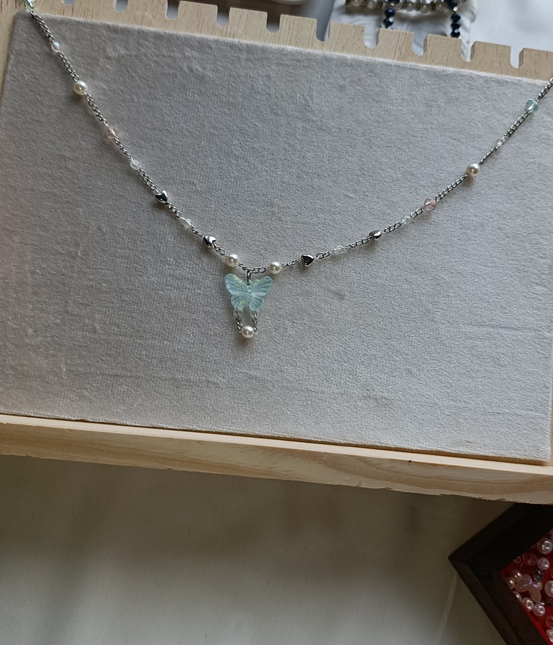 Description: A minimalist silver-toned chain necklace featuring small interspersed pearls and heart-shaped beads. The centerpiece is a translucent, iridescent blue butterfly pendant that catches the light.