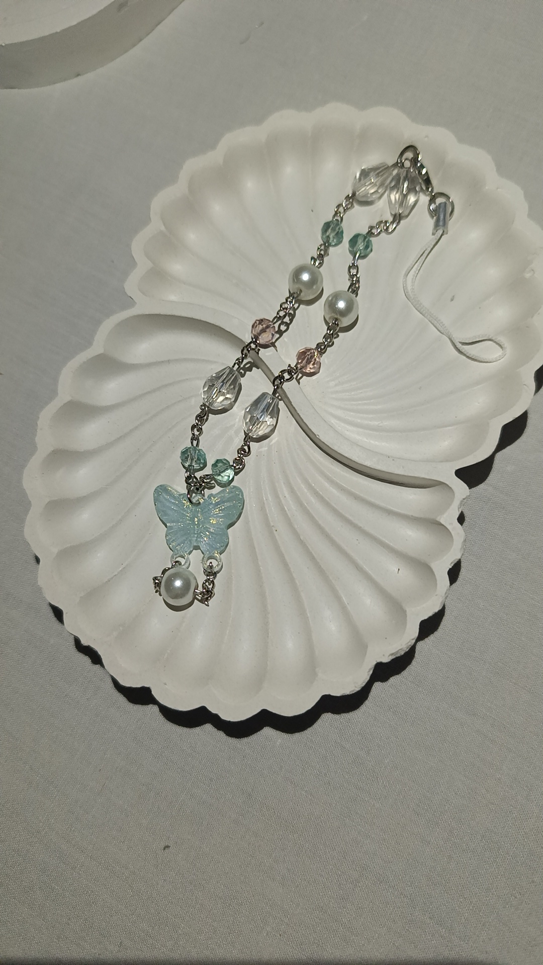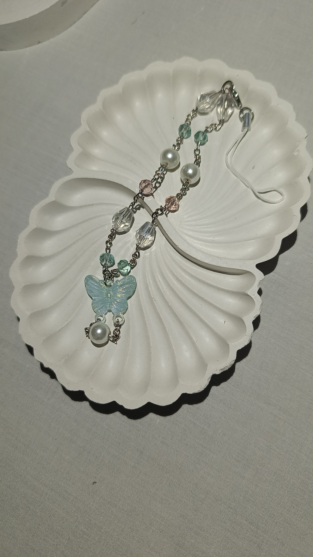 Description: A complex phone or bag charm featuring a double-strand design. It showcases an iridescent blue butterfly, clear faceted “crystal” beads, and soft pink accents on a silver-toned chain.