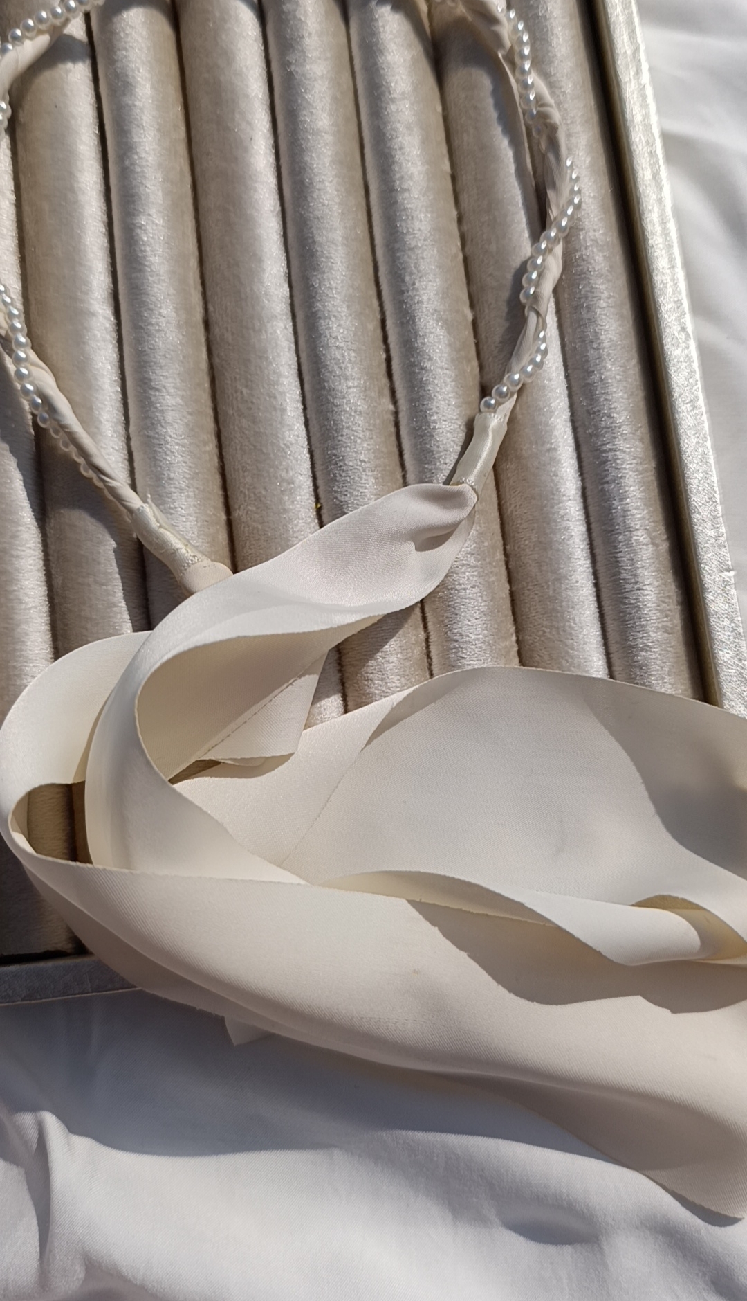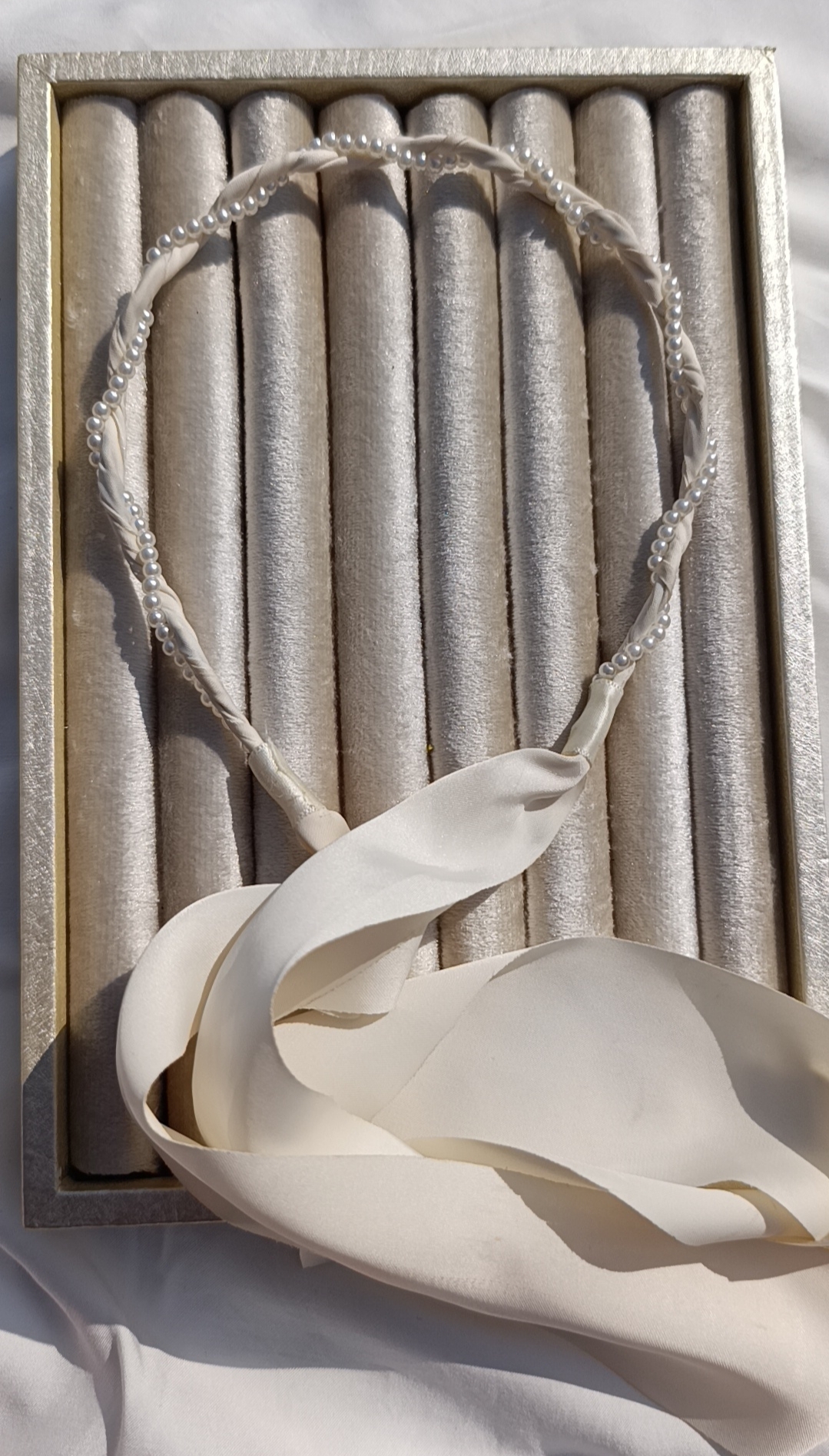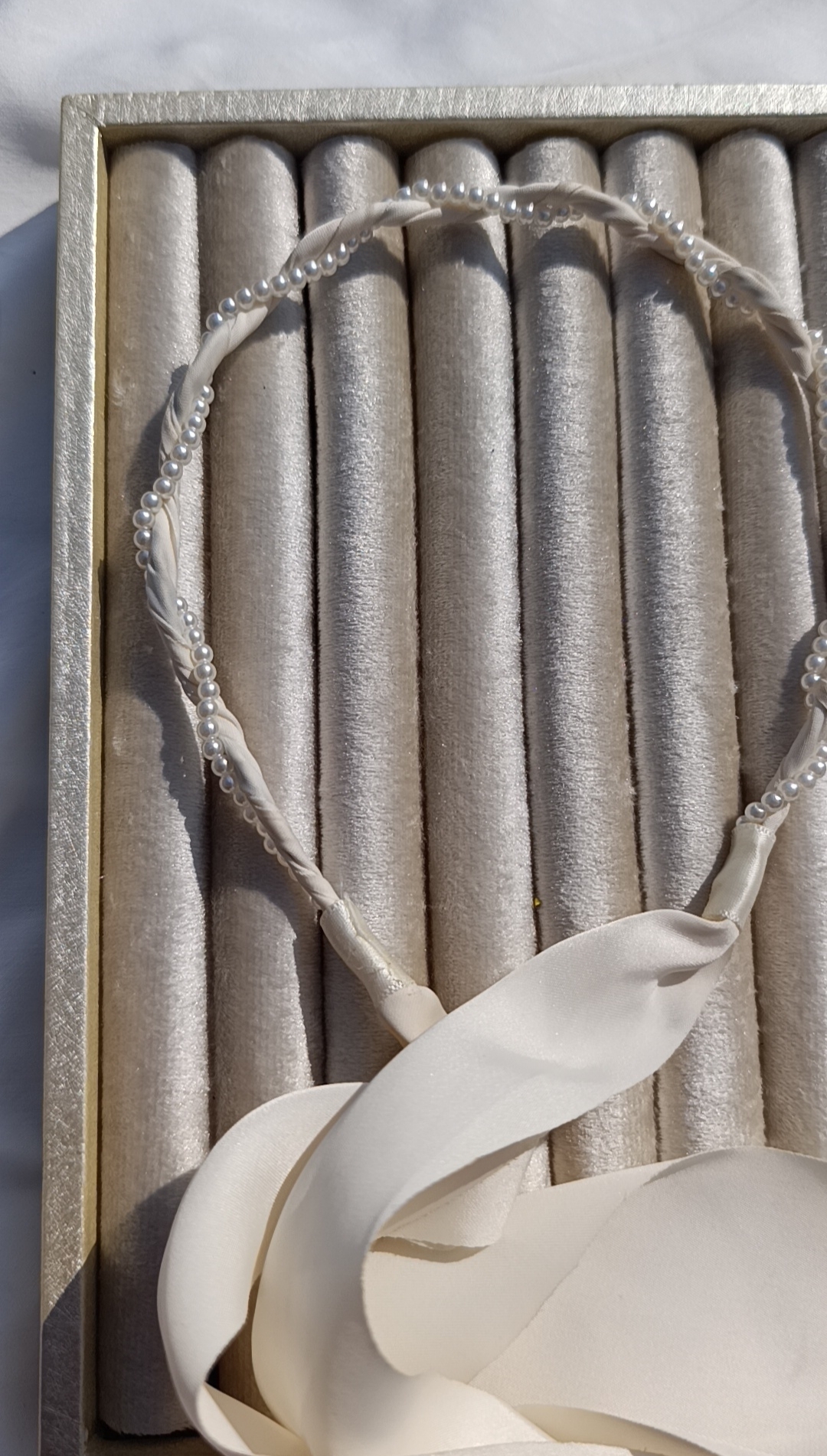 Description: A sophisticated, halo-style headband featuring a delicate strand of faux pearls meticulously twisted with a cream-colored satin ribbon. The design culminates in long, flowing ribbon tails that can be tied into a bow or left to hang gracefully with loose hair.
