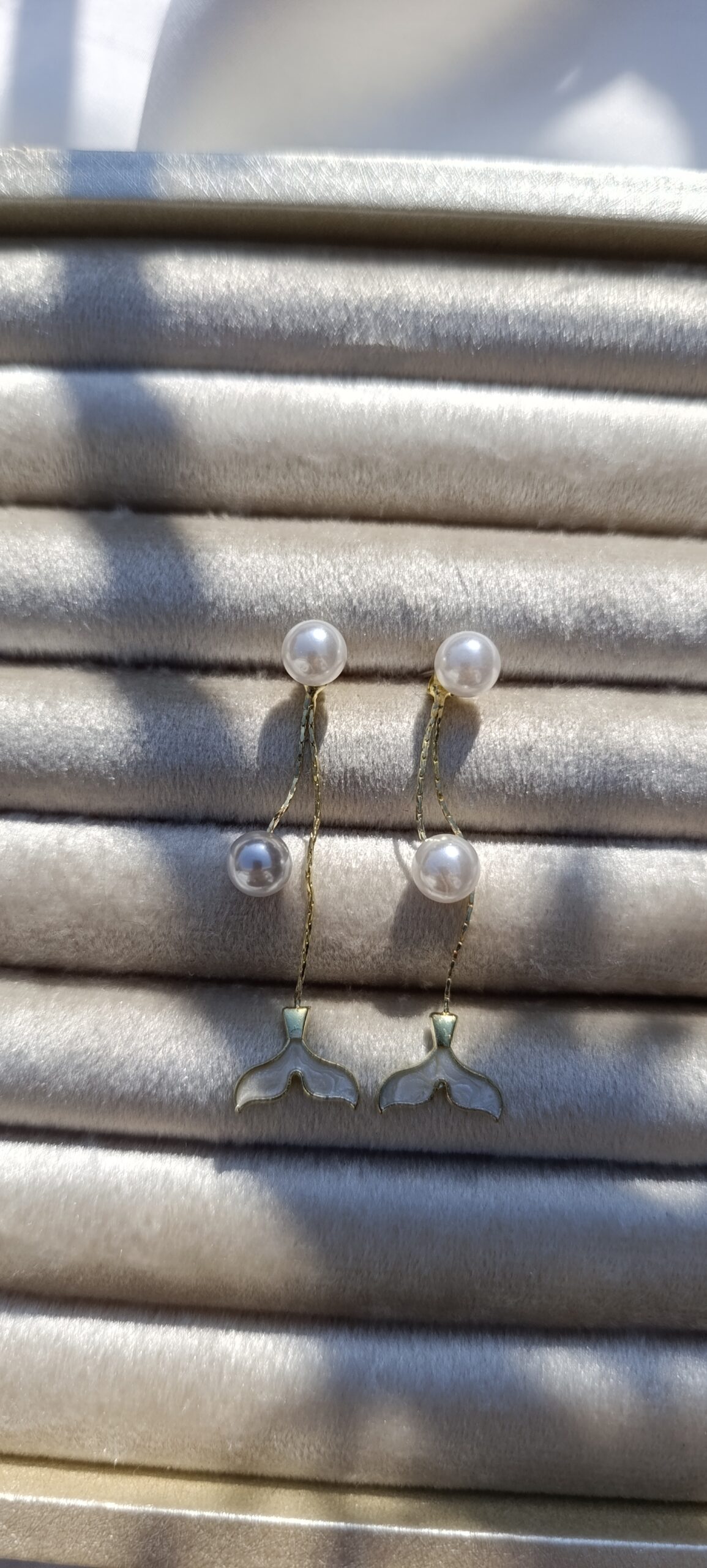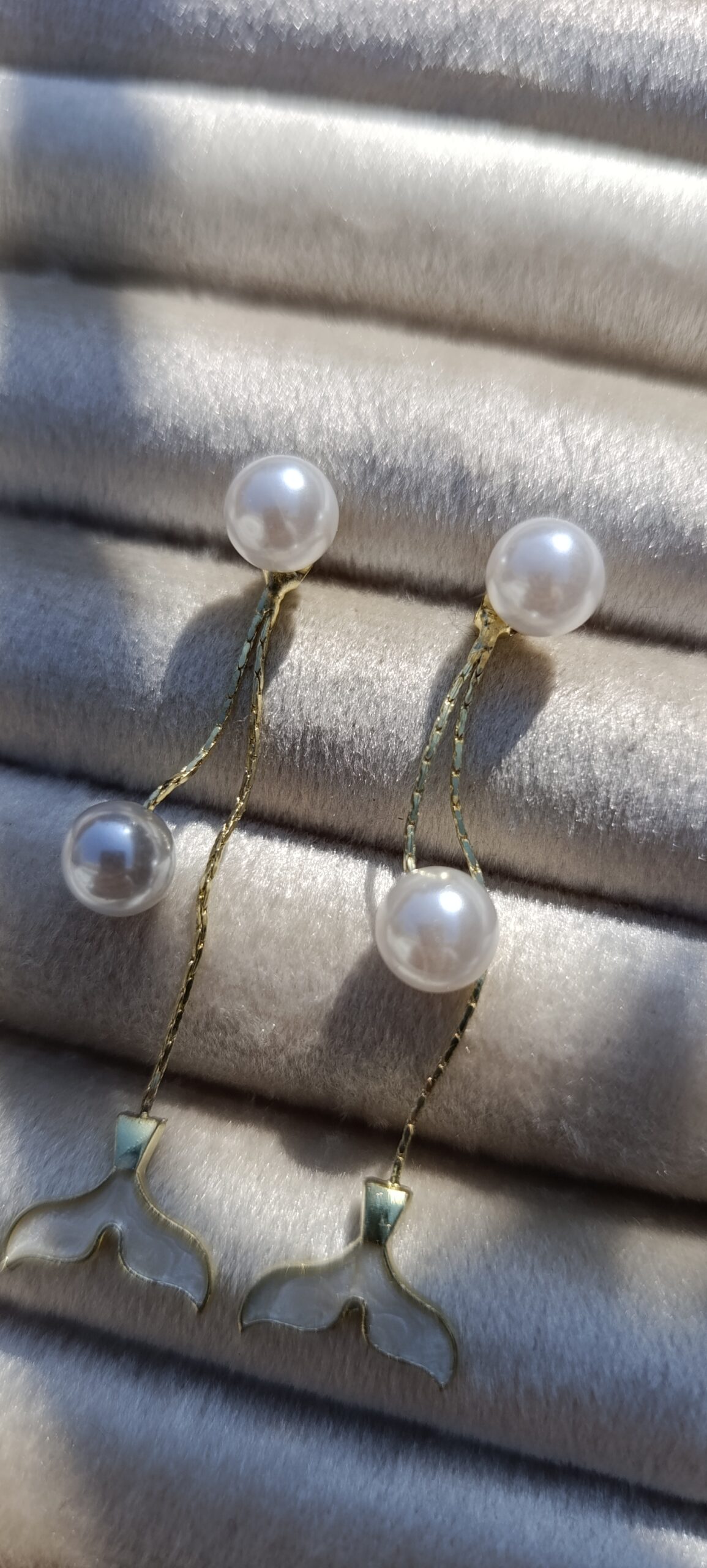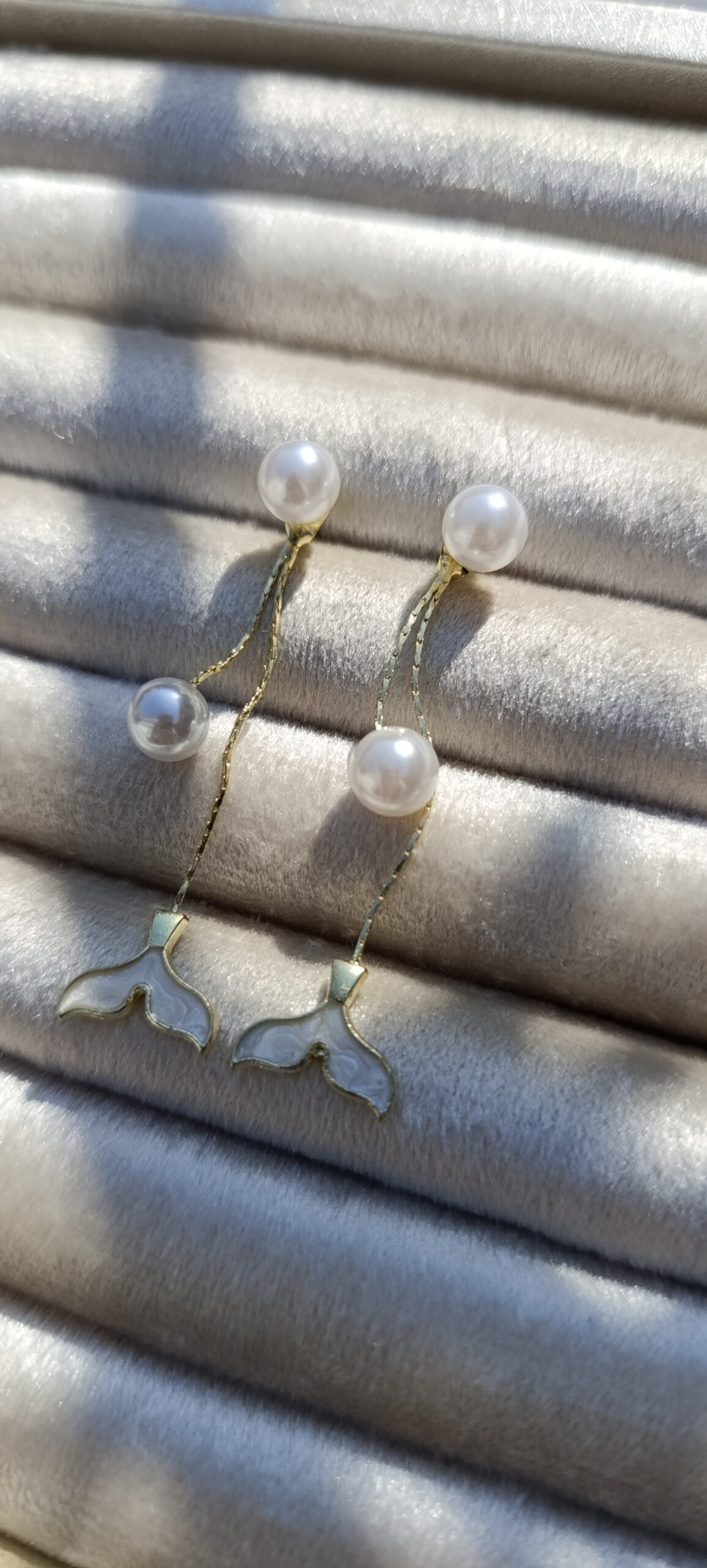 Description: A whimsical pair of drop earrings featuring a “front-to-back” style. The front is a simple pearl stud, while a gold-toned chain hangs behind the ear, ending in a white enamel-filled mermaid tail (or whale tail) charm. An additional pearl is nestled along the chain for extra movement.