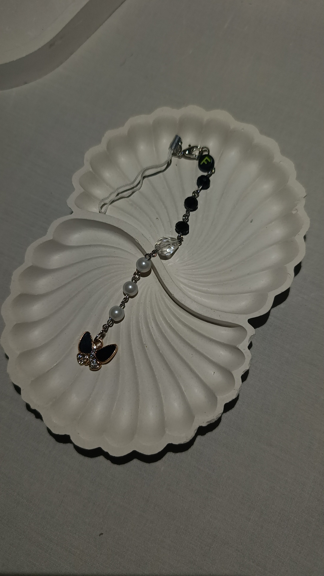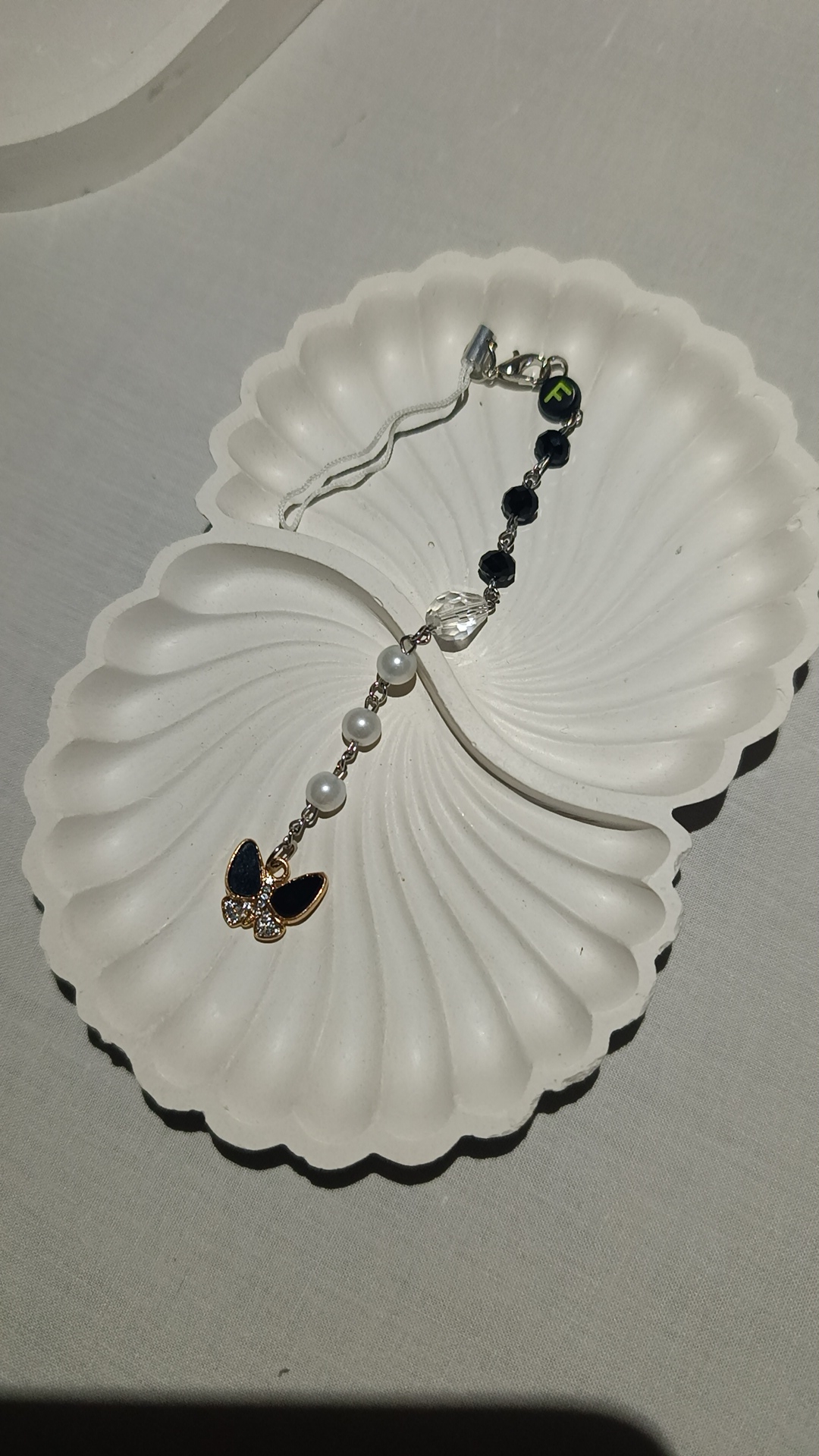 Description: A delicate accessory designed to attach to a phone case. It features a gold-toned butterfly with black enamel wings and crystal accents, followed by a string of alternating faux pearls and faceted black beads.