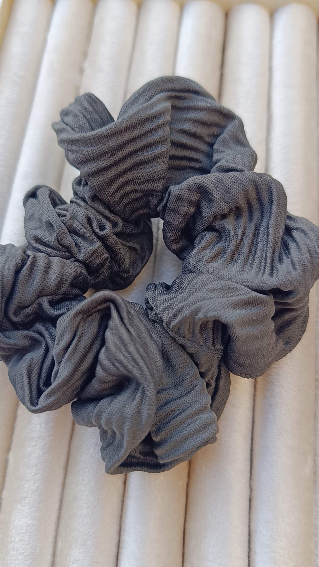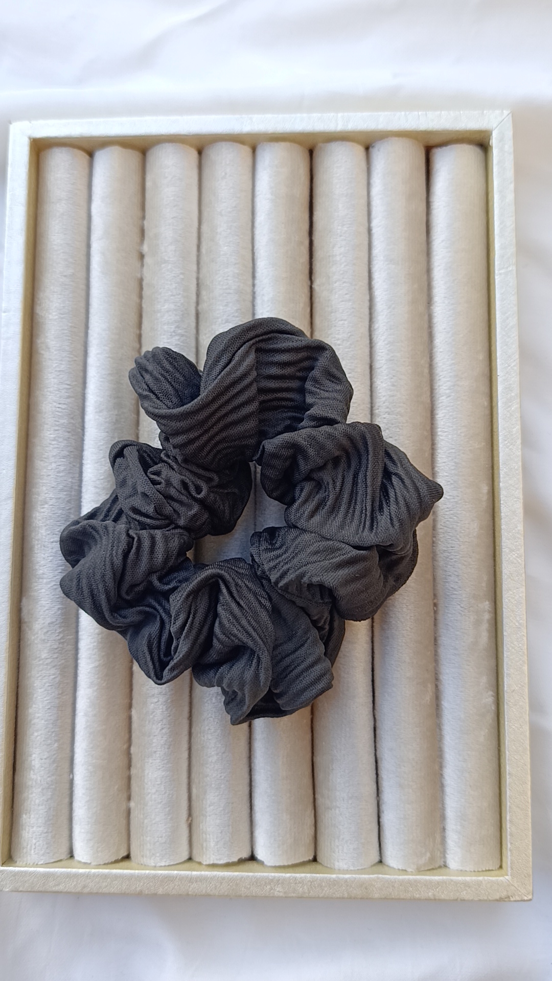 Description: Anything but a basic black hair tie. This scrunchie is crafted from a plissĂ© (pleated) fabric that creates deep, elegant shadows and a sculptural look. The lightweight material has a beautiful “bounce” and a high-fashion edge.