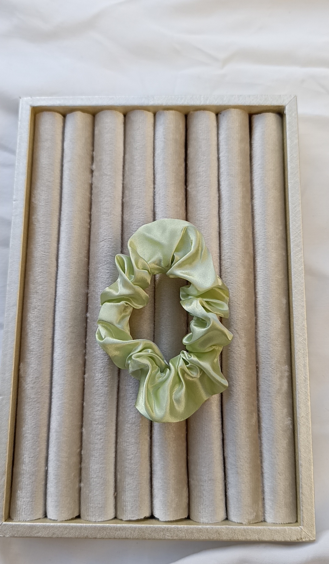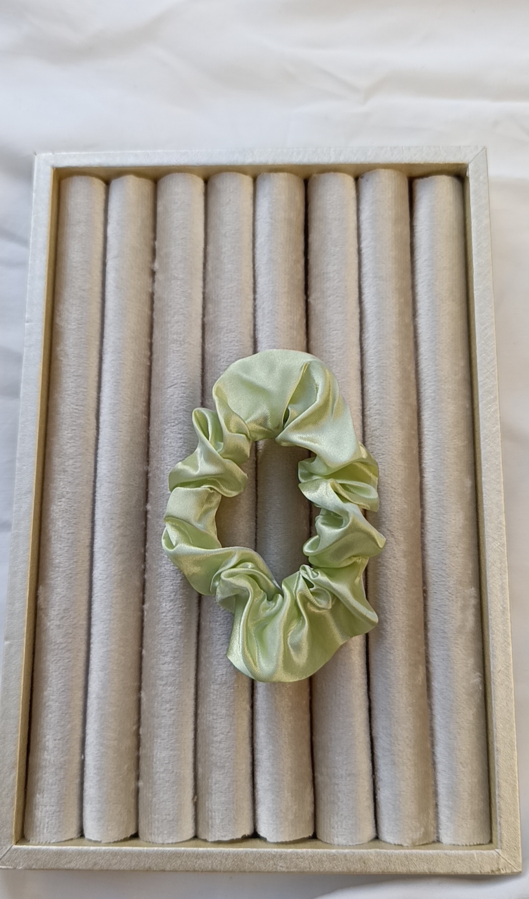 Description: This lightweight satin scrunchie features a beautiful pale green hue. The smooth material is designed to slide off hair easily without pulling or snagging.
