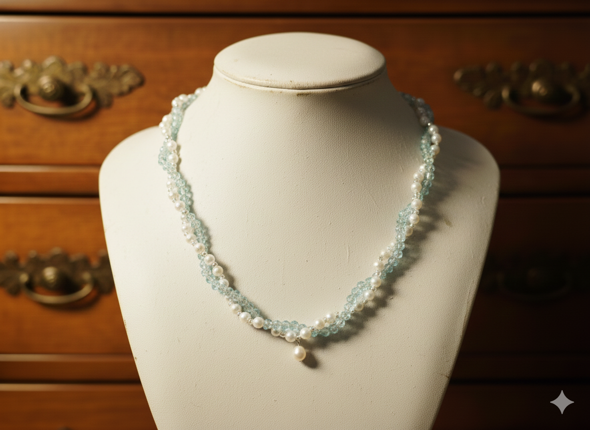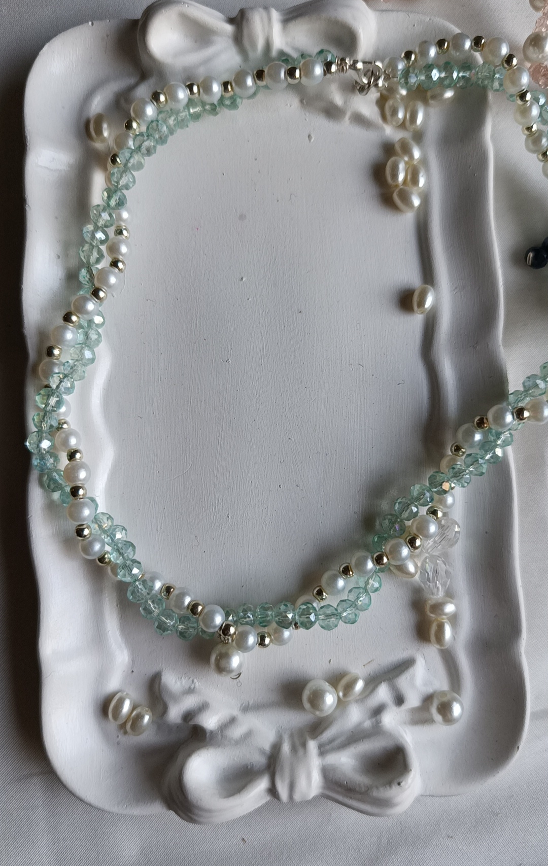 Description: A multi-textured necklace featuring a “twisted” look. It combines round white pearls with translucent mint-green faceted beads, separated by tiny silver-toned spacer beads.