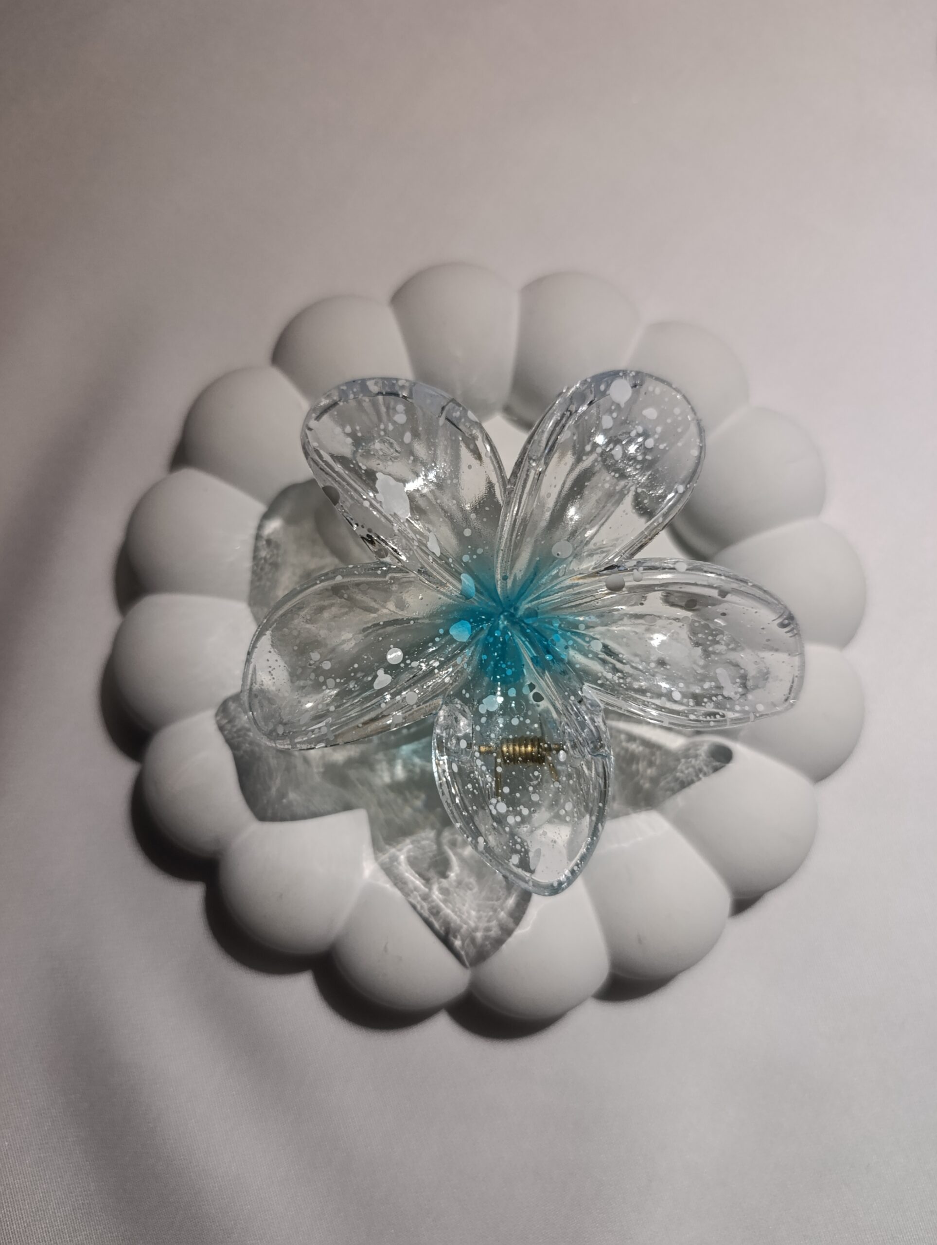 Description: Sophistication meets nature in this clear resin clip. It is densely packed with white flecks that concentrate toward the center. This design creates a luxurious, “frozen-in-time” floral look that is perfect for weddings, parties, or adding a touch of class to your work attire.