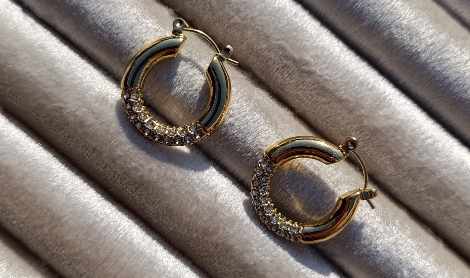 Description: A modern take on the classic hoop, these earrings feature a smooth, thick gold top that transitions into a densely encrusted crystal lower half. The weight is perfectly balanced for comfortable all-day wear while offering maximum sparkle.