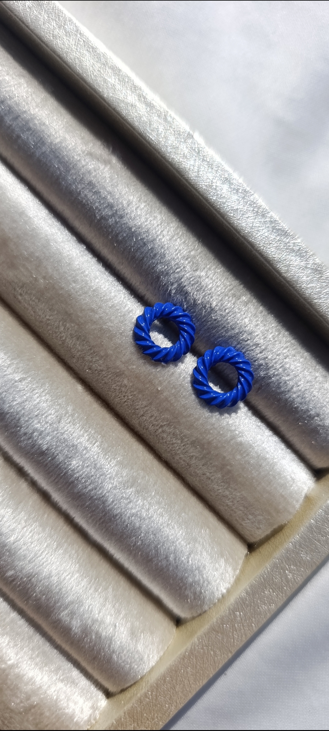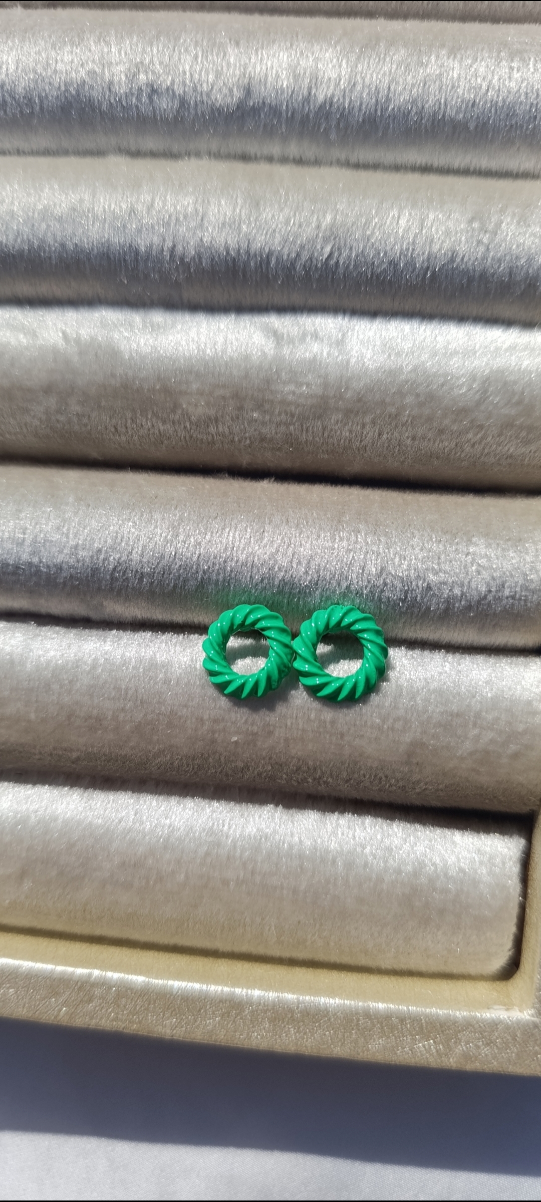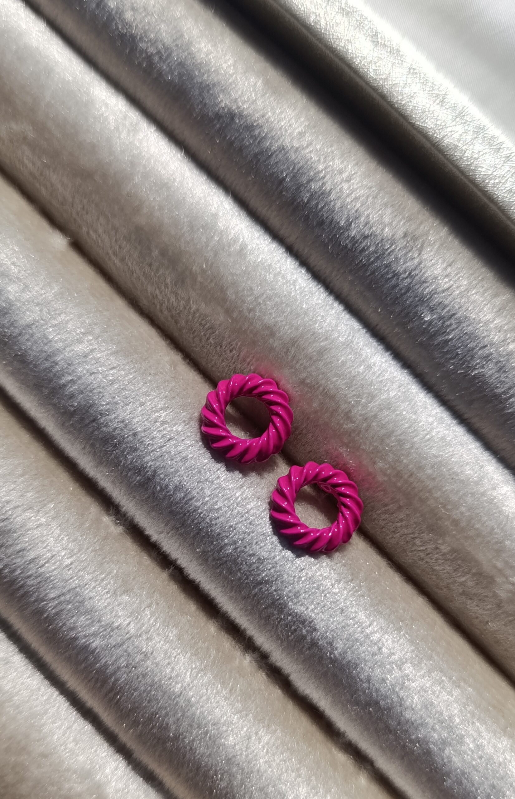 Description: These are small, circular stud earrings with a textured, “twisted rope” or “croissant” style design. They are coated in a vibrant colour.