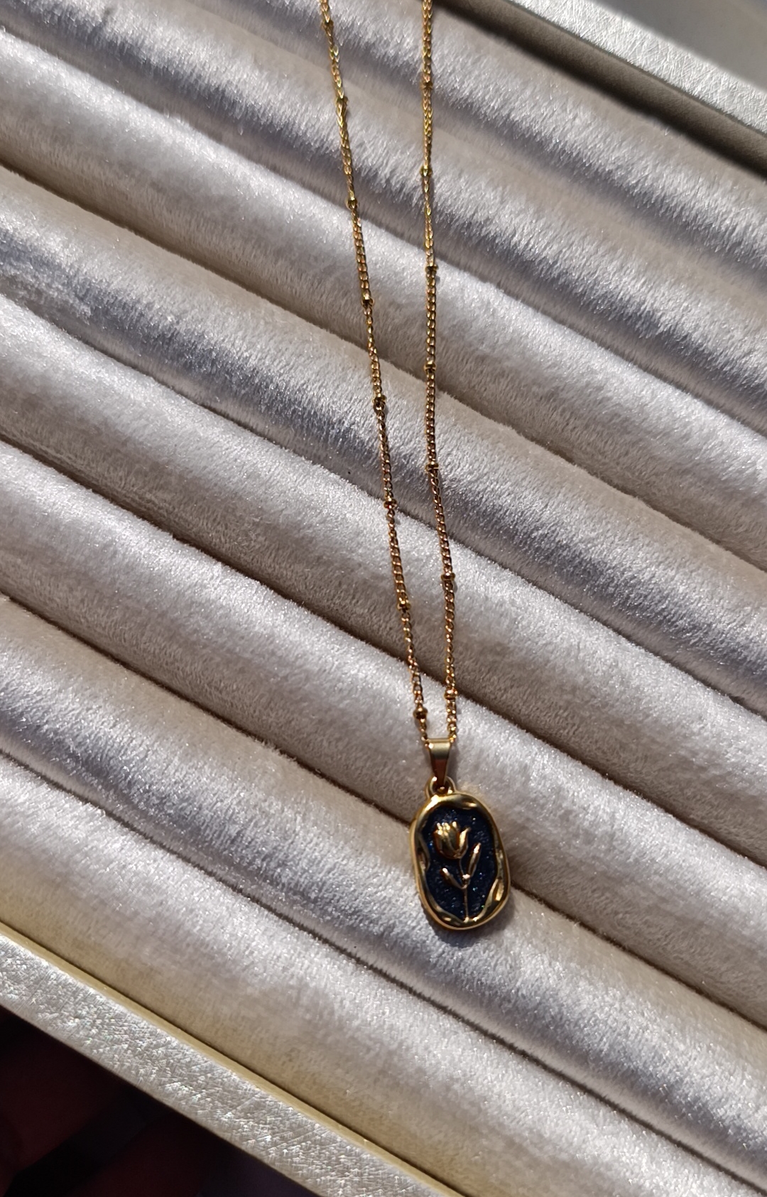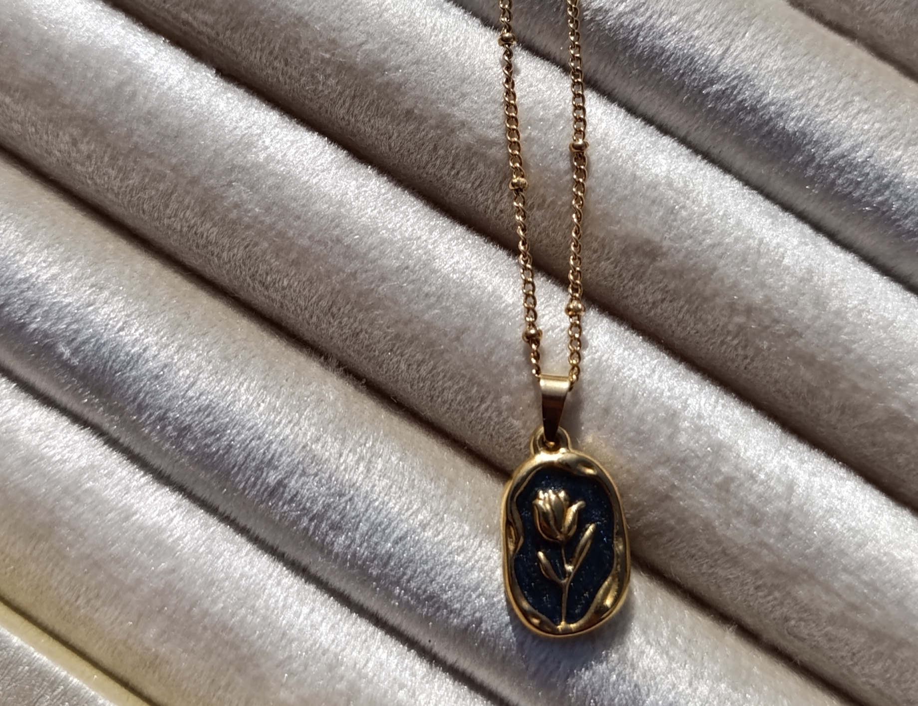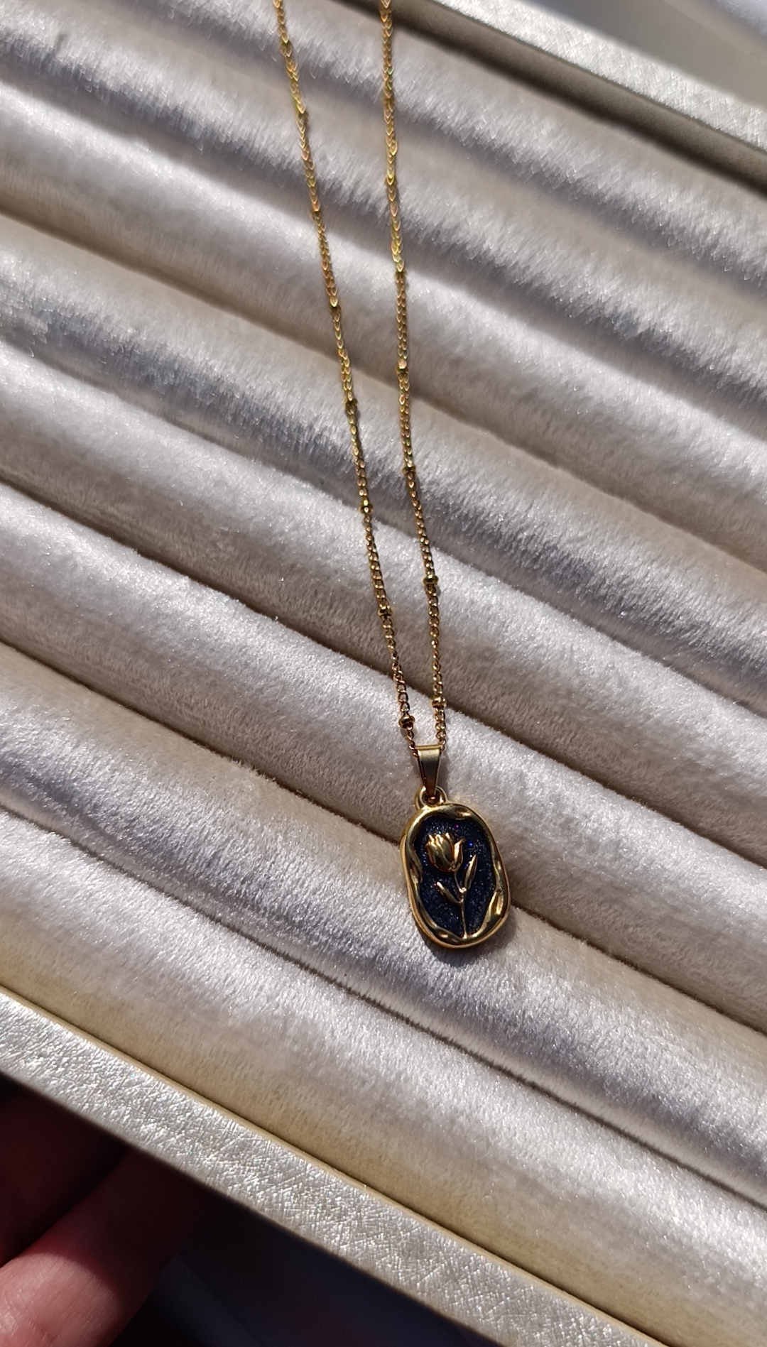 Description: This vintage-inspired piece features a textured gold-tone tulip embossed onto a black, galaxy-effect enamel or resin inlay. The oval frame has a slightly molten, organic texture.