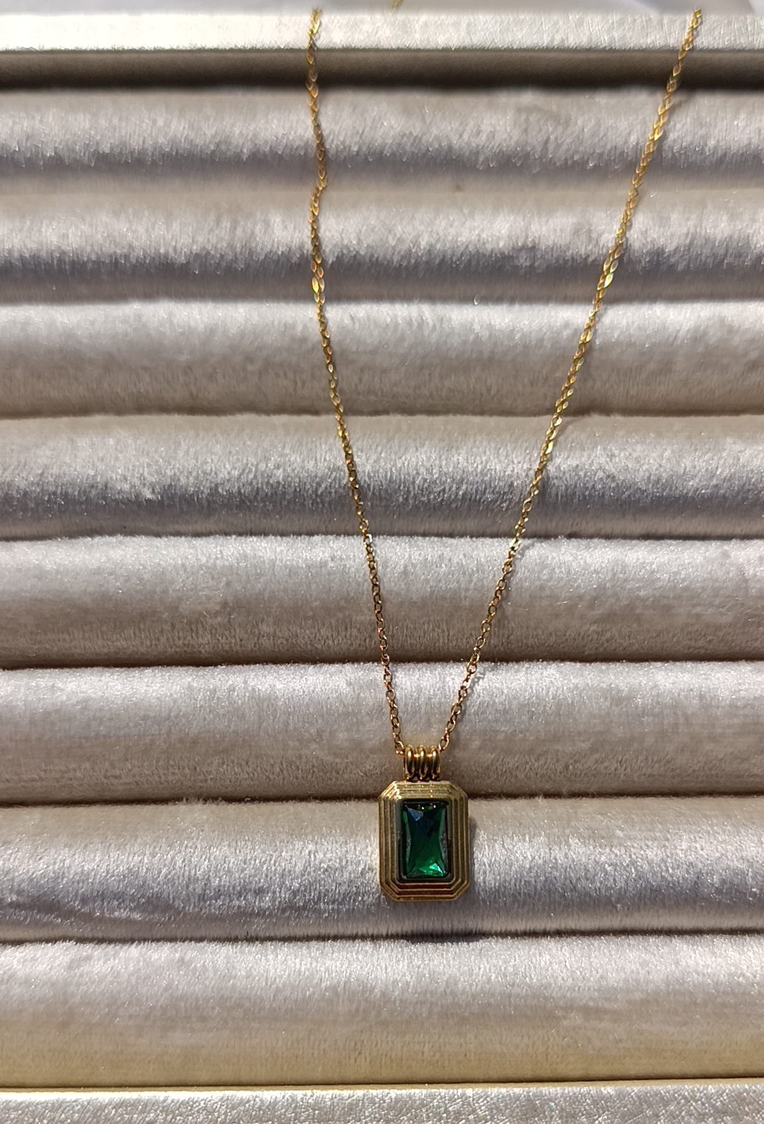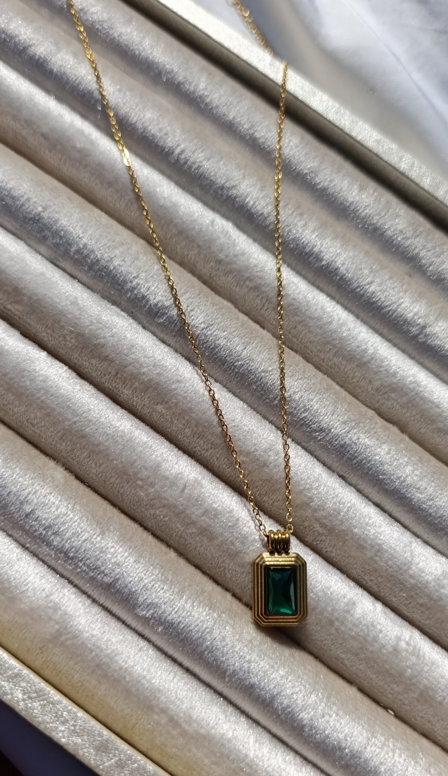 Description: This elegant necklace features a rich, rectangular emerald-green zircon set within a meticulously textured gold frame. The grooved, multi-layered border adds a vintage Art Deco flair, making it a sophisticated statement piece for both day and evening wear.
