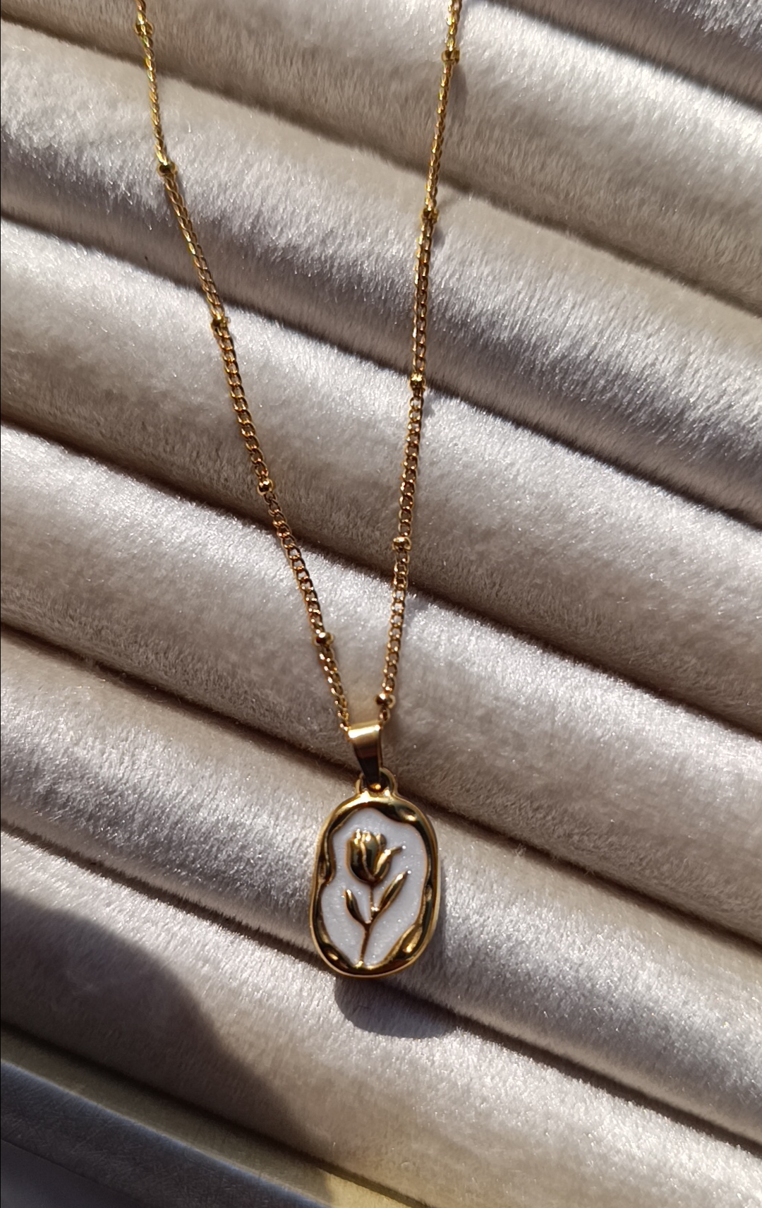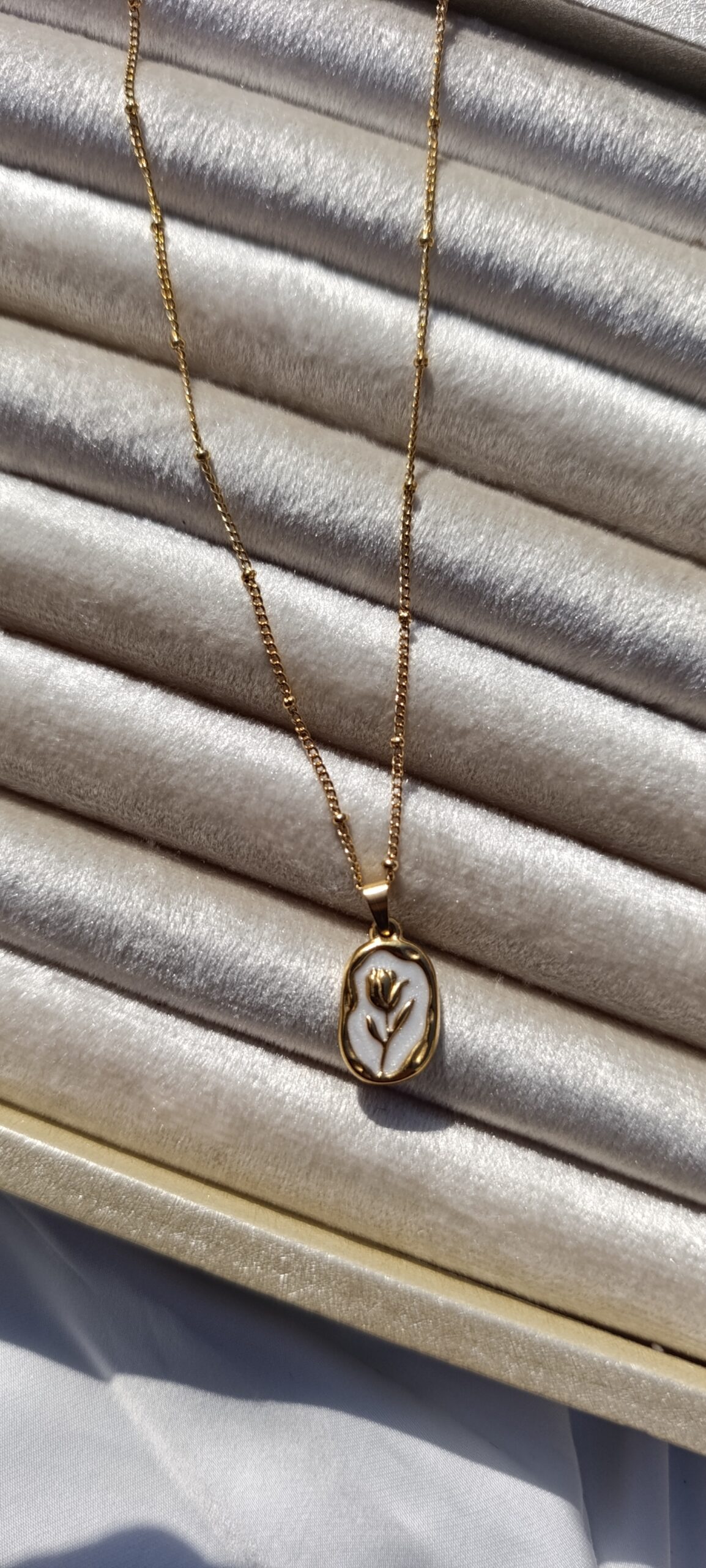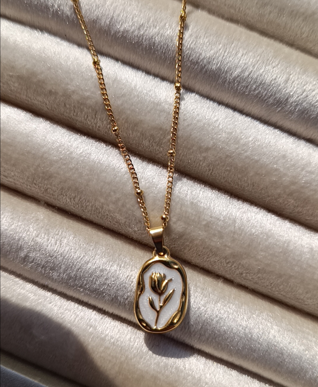 Description: A sister piece to the blue tulip, this version features a gold-tone tulip relief against a creamy white, iridescent background. The pendant hangs from a dainty satellite chain.